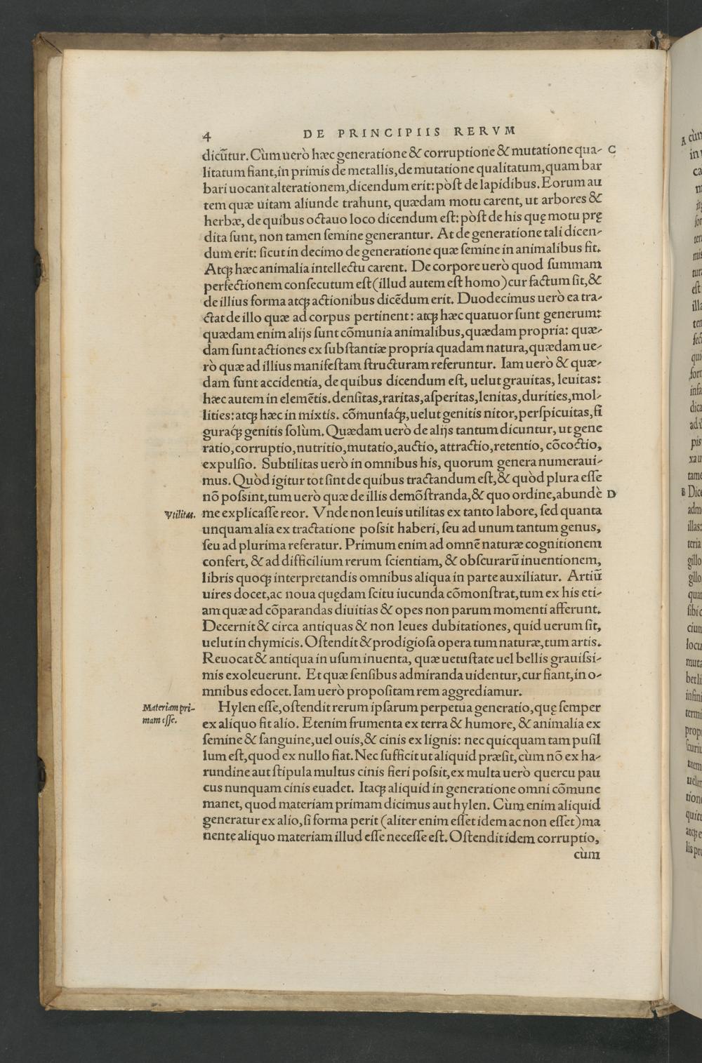 dicũtur. Cum uerd hæc generatione& corruptione& mutatione qua- C litatum fiant, in primis de metallis, de mutatione qu alitatum, quam bar b bari uocant alterationem, dicendum erit: poſt de lapidibus. Eorum au tem quæ uitam aliunde trahunt, quædam motu carent, ut arbores& herbæ, de quibus octauo loco dicendum eſt: poſt de his quę motu prę dita ſunt, non tamen ſemine generantur. At de generatione tali dicen- dum erit: ſicut in decimo de generatione quæ ſemine in animalibus fit. Atq; hæc animalia intellectu carent. De corpore uerd quod ſummam erfectionem conſecutum eſt(illud autem eſt homo)cur factum ſit,& de illius forma atc; actionibus dicẽdum erit. Duodecimus uerò ea tra- ctat de illo quæ ad corpus pertinent: atq; hæc quatuor ſunt generum: quædam enim alijs ſunt cõmunia animalibus, quædam propria: quæ- dam ſunt actiones ex ſubſtantiæ propria quadam natura, qu ædam ue- rò quæ ad illius manifeſtam ſtructuram referuntur. Iam uerò& quæ- dam funt accidentia, de quibus dicendum eſt, uelut grauitas, leuitas: haæec autem in elemẽtis. denſitas, raritas, aſperitas, lenitas, durities, mol- lities:atqʒ hæc in mixtis. cõmunſiaq́;, uelut genitis nitor, perſpicuitas, ſi guraq́ʒ genitis ſoluum. Quædam uerdò de alijs tantum dicuntur, ut gene ratio, corruptio, nutritio, mutatio, auctio, attractio, retentio, cõcoctio, expulſio. Subtilitas uerd in omnibus his, quorum genera numeraui- mus. Qudd igitur tot ſint de quibus tractandum eſt,& quòd plura eſſe nõ poſsint, tum uerò quæ de illis demõſtranda,& quo ordine, abundè D vtilits. me explicaſſe reor. Vnde non leuis utilitas ex tanto labore, ſed quanta unquam alia ex tractatione poſsit haberi, ſeu ad unum tantum genus, ſeu ad plurima referatur. Primum enim ad omnẽ naturæ cognitionem confert,& ad difficilium rerum ſcientiam,& obſcurarũ inuentionem, libris quoq; interpretandis omnibus aliqua in parte auxiliatur. Artiũ uires docet, ac noua quędam ſcitu iucunda cõmonſtrat, tum ex his eti- am quæ ad cõparandas diuitias& opes non parum momenti afferunt. Decernit& circa antiquas& non leues dubitationes, quid uerum ſit, uelut in chymicis. Oſtendit& prodigioſa opera tum naturæ, tum artis. Reuocat& antiqua in uſum inuenta, quæ uetuſtate uel bellis grauiſsi- mis exoleuerunt. Et quæ ſenſibus admiranda uidentur, cur fiant, in o- mnibus edocet. Iam uerò propoſitam rem aggrediamur. Materimm pri-· Hylen eſſe, oſtendit rerum ipſarum perpetua generatio, quę ſemper mam ſe. ex aliquo fit alio. Etenim frumenta ex terra& humore, 3& animalia ex ſemine& ſanguine, uel ouis,& cinis ex lignis: nec quicquam tam puſil lum eſt, quod ex nullo fiat. Nec ſufficit ut aliquid præſit, cum nõ ex ha- rundine aut ſtipula multus cinis fieri poſsit, ex multa uerò quercu pau cus nunquam cinis euadet. Itaq; aliquid in generatione omni cõmune manet, quod materiam primam dicimus aut hylen. Cum enim aliquid generatur ex alio, ſi forma perit(aliter enim eſſet idem ac non eſſet) ma nente aliquo materiam illud eſſe neceſſe eſt. Oſtendit idem corruptio, b cum