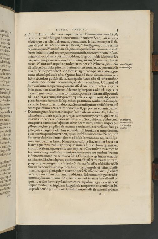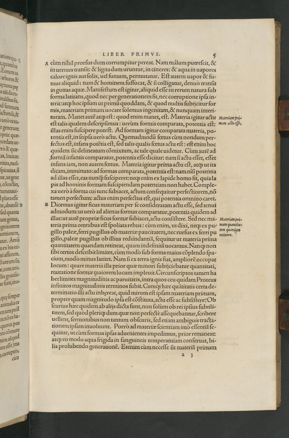 admodum: utuerò ad alienas formas comparatur, potentia quidem ad illas: ut autẽ propriæ ficus formæ ſubiacet, actu conſiſtere. Sed nec ma- teria prima omnibus eſt ſpoliata rebus: cum enim, ut dixi, neq; ex pu/ gillo paleæ, ferri pugillus ob materiæ paucitatem, nec rurſus ex ferri pu gillo, paleæ pugillus ob illius redundantiã, ſequitur ut materia prima quantitatem quandam retineat, quam indefinitã uocamus. Nanq; non ſibi certos deſcribit limites, cum moddò ſub forma maius cõplendo ſpa- cium, modo minus latitet. Nam ſi ex terra ignis fiat, ampliorẽ occupat locum: quare materia illa prior quæ minori ſubijciebatur quantitati, mutatione formæ maiorem locum impleuit. Circunſcriptos tamen ha bet limites magnitudinis ac paruitatis, intra quos ceu quidam Proteus infinitos magnitudinis terminos ſubit. Cumq́; hæc quãtitatis certa de- terminatio illi actu inhęreat, quid mirum eſt ipſam materiam primam, propter quam magnitudo ipſa eſt cõſtituta, actu eſſe ac ſubſiſtere? Ob ſcurius hæc quidem ab alijs dicta ſunt, non ſolum ob rei ipſius ſubtili- tatem, ſed quod pleriq; dum quæ non perfectè aſſequebantur, ſcribere uellent, ſermonibus non tantum obſcuris, ſed etiam ambiguis tracta- tionem ipſam inuoluunt. Porrò ad materiæ ſcientiam imò eſſentiã ſe- quitur, ut cum formas ipſas aduenientes impedimus, prior remaneat: atq; eo modo aqua frigida in ſanguineis temperantiam conſeruat, bi- lis prohibendo generationẽ. Etenim cum neceſſe ſit materiã primam b 2 3