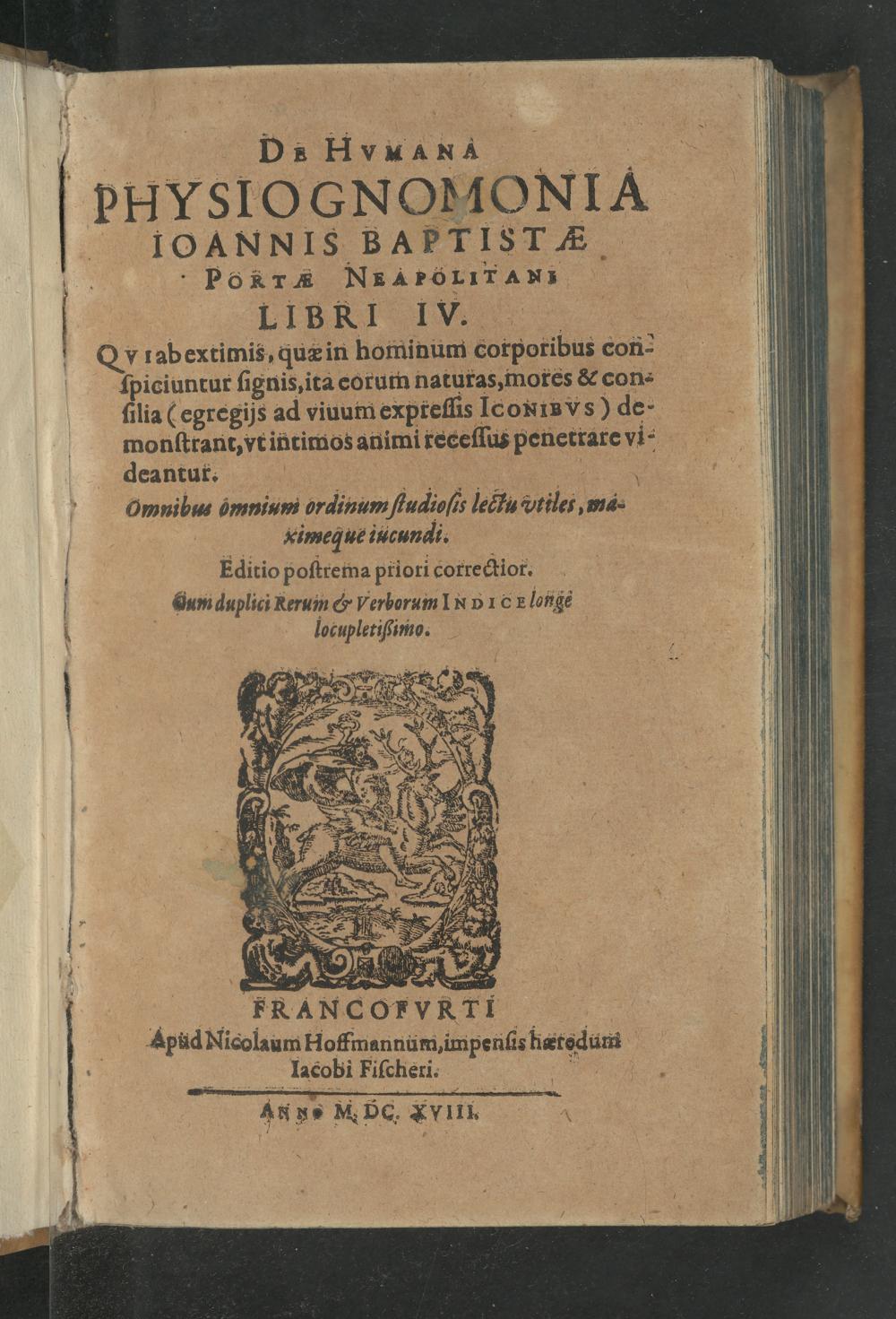 10ANNIS BAFTISTS PoRTR NIAPGLITANS LIBRI IVTV.. QViabextimis, quæ in hominum corporibus con- Ipiciuntur ſignis, ita corum naturas, mores& con- ſilia(egregijs ad viuum expreſſis IconinVs) de- monſtrant, vt intimos animi receſſus penetrare vi⸗: deantur. V Omnibus ömnium ordinum ſtudioſis leclu vtiles, ma- ximeque iucundi. Editio poſtrema priori correctior. dum duplici Rerum& Verborum INPICElonge locupletißimo.