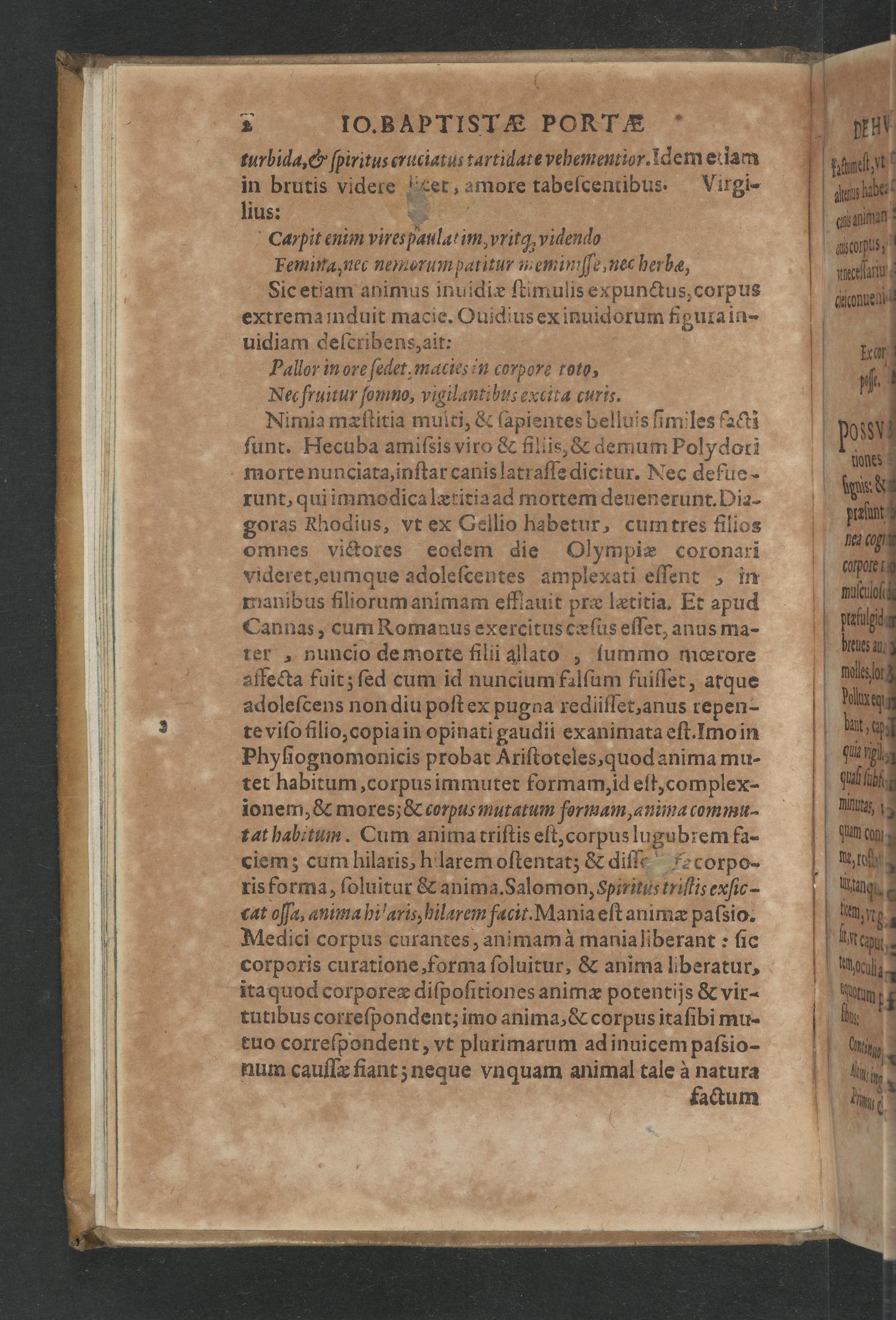 2 10.BAPTISTEÆ PORTES turbida,& ſpiritus eruciatus tartidate vehementior. Idem etiam in brutis videre Icet, amore tabeſcentibus. Virgi- lius: b Carpit enim vires paulatim, vritq, videndo Femina, nec nemorum patitur meminiſſe, nec herbæ,