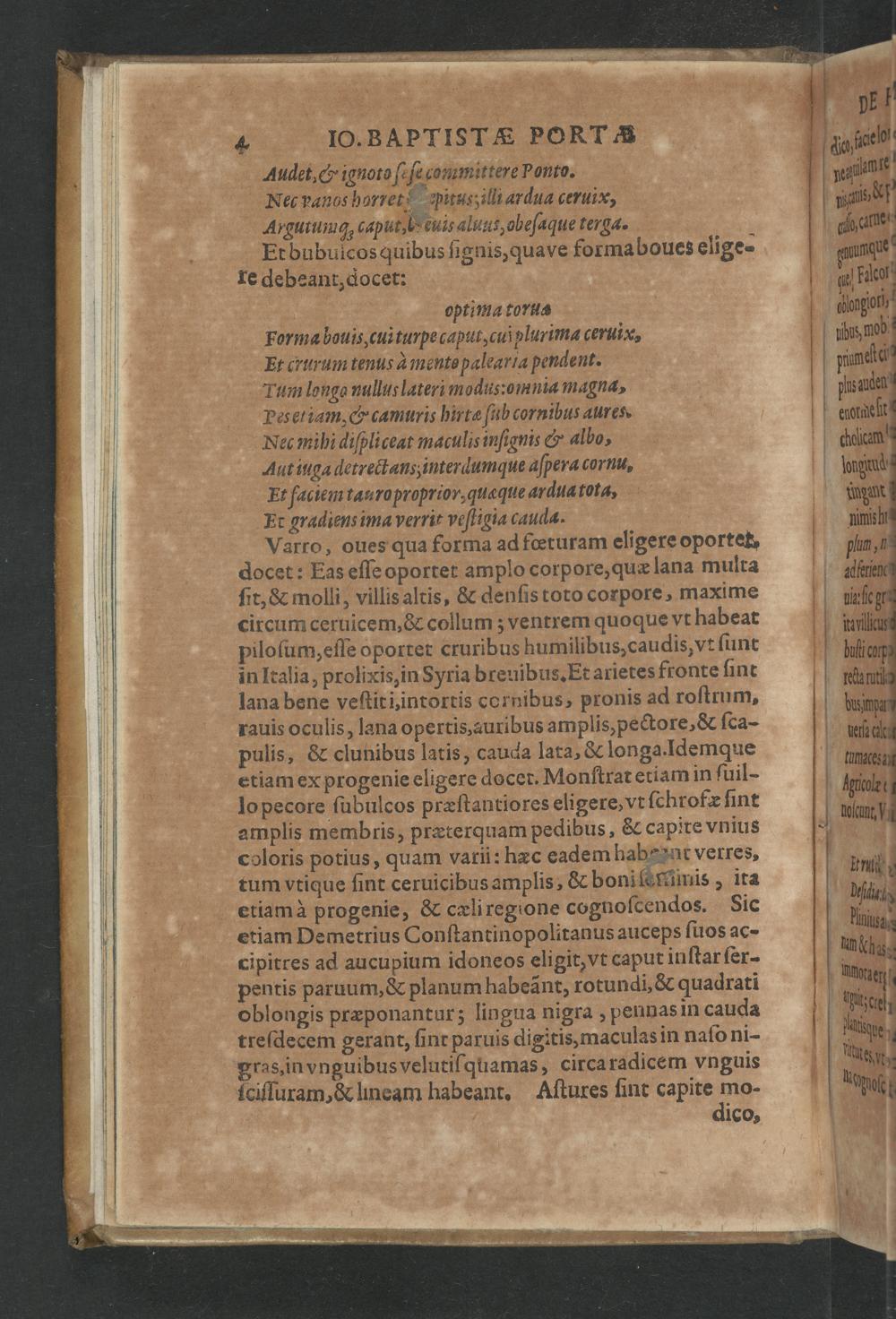 Varro, oues qua forma ad fœturam eligere oportet. docet: Eas eſſe oportet amplo corpore, quæ lana multa ſit,& molli, villis altis,& denſis toto corpore, maxime circum ceruicem,& collum; ventrem quoque vt habeat piloſum, eſſe oportet cruribus humilibus, caudis, vt ſunt Win Italia, prolixis, in Syria breuibus. Et arietes fronte ſint lana bene veſtiti,intortis cornibus, pronis ad roſtrum, rauis oculis, lana opertis, auribus amplis, pectore,& ſca- pulis,& clunibus latis, cauda lata,& longa. lIdemque etiam ex progenie eligere docet. Monſtrat etiam in ſuil- lopecore ſubulcos præſtantiores eligere, vt ſchrofæ fint amplis membris, præterquam pedibus,& capite vnius coloris potius, quam vari: hæc eadem habeant vetres, tum vtique ſint ceruicibus amplis,& boni ſerinis, ita etiamà progenie,& cæli regione cognoſcendos. Sic etiam Demetrius Conſtantinopolitanus auceps ſuos ac- cipitres ad aucupium idoneos eligit, vt caput inſtar ſer- pentis paruum,& planum habeãnt, rotundi,& quadrati oblongis præponantur; lingua nigra, pennas in cauda treſdecem gerant, ſinr paruis digitis, maculas in naſo ni- gras. in vnguibus velutiſquamas, circa radicem vnguis ſciſſuram,& lineam habeant. Aſtures ſint epite mo
