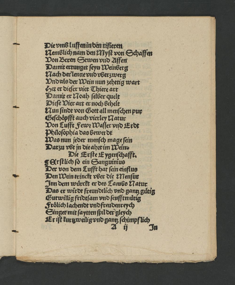 Die vmb luffenin den riſieren Nemblich nam den Myſt von Schaffen Von Beren Sewen vnd Affen Damit ertunget ſeyn Weinberg Nach der lenge vnd vberzwerg Vndals der Wein nun zehttig wart OHet er dieſer vier Thiere art Damit er Noah ſelber quelt Dieſe Vier art er noch behelt Nun ſindt von Gott all menſchen puxy Geſchoͤpfft auch vierley Natur Von Lufft Fewꝛ Waſſer vnd LErdt Philoſophia das bewer dt b Was nun jeder menſch mage ſein Darzu võt jn die ahꝛt im Weinn⸗ Die Erſte Eygenſchafft.
