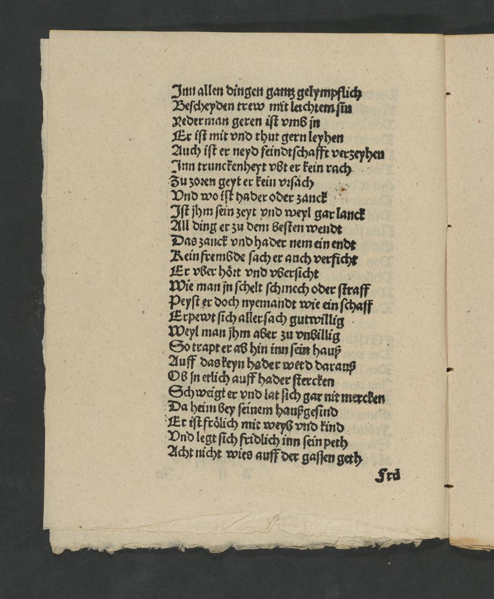 Yeder man geren iſt vmb jn Er iſt mit vnd thut gern leyhen Auch iſt er neyd feindtſchafft verzeyhen Inn trunckenheyt vbt er kein rach Zu zoꝛen geyt er kein vſch Vnd wo iſt hader oder zanch Iſt jhm ſein zeyt vnd weyl gar lanc All ding er zu dem beſten wendt Das zanck vnd hader nem ein endt Kein frembde ſach er auch verficht Er vber hoͤꝛt vnd vberſicht— Wie man ſn ſchelt ſchmech oder ſtraff Peyſt er doch nyemandt wie ein ſe chaff Erpewt ſich allerſach gutwillig Weyl man jhm aber zu vnbillig So trapt er ab hin inn ſein hauß b Auff das keyn hader werd daraug- Os ſn etlich auff hader ſtercken Schweigt er vnd lat ſich gar nit mercken Da heim bey ſeinem haußgeſind Er iſt froͤllch mit weys vnd kind Vnd legt ſich fridlich inn ſein peth Acht nicht wies auff der gaſſen geth