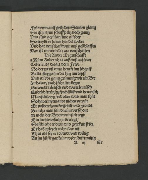 Die Ander Eygenſchafft gZum Andern hat auß einflus ſtewꝛ Tolericus/ die art vom Fewꝛ So der zu vil wein henckt inn ſchopff Baldt Iſteyger jm die hitz inn kopff Vnd wirdt gantz grimmig wieemn Ber Zu hader frach ſteht ſein beger Er wirdt tuckiſch vnd wetetleuniſch Endtich/ truͤtig/ frech/ boͤß vnd hewniſch Man hhu red oder was man thůt So hat er nyemandt nichts vergůüt Er poldert/ zancket/ ſchilt vnd grondt e mehꝛ man ſein darinn verſchont xYe mehꝛ der Beren wein ſich regt Ein leichte vꝛſach jn bewegt. So ſchlecht er dꝛein vnd geyt kein frid Lr has geleych recht oder nit Thut als ſey er tobendt vnd wuͤtig