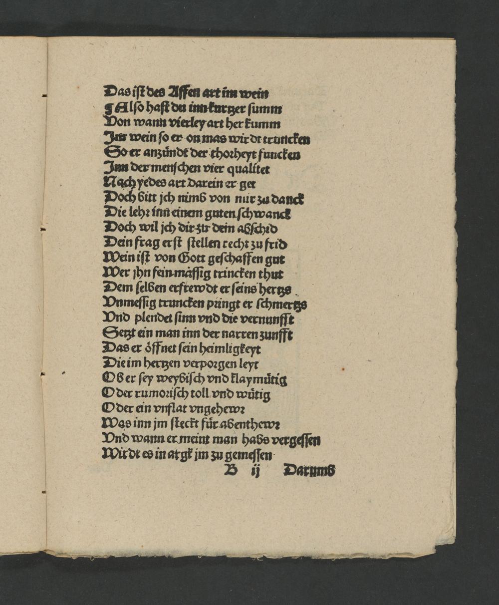 Das iſt des Affen art im wein ¶KAlſo haſt du inn kurtzer ſumm Von wann vierley art her kumm Ins wein ſo er on mas wirdt truncken Soer anzundt der thoꝛheyt funcken Inn der menſchen vier qualitet Nach yedes art darein er ger Doch bitt jch nimb von nur zu danck Die lehꝛ inn einem guten ſchwanck Doch wil jch dir zur dein abſchid Dein frag erſt ſtellen cecht zu frid Wein iſt von Gott geſchaffen gut Wer ihn fein mãfſig trincken thut Dem ſelben erftewdt er ſeins hertzs Vnmeſſig truncken pꝛingt er ſe chmertzs YVnd plendet ſinn vnd die vernunfſt Sett ein man inn der narren zunfft Das er oͤffnet ſein heimligkeyt Die im hertzen verpoꝛgen leyy Ober ſey weybiſch vnd klaymuͤtig O der rumoꝛiſch toll vnd wůtig Oder ein vnflat vngehew: Was inn jm ſteckt fuͤr abenthewꝛ Vnd wann er meim man habso vergeſſen MWudt es in argk jm zu gemeſſen b B ij Darums