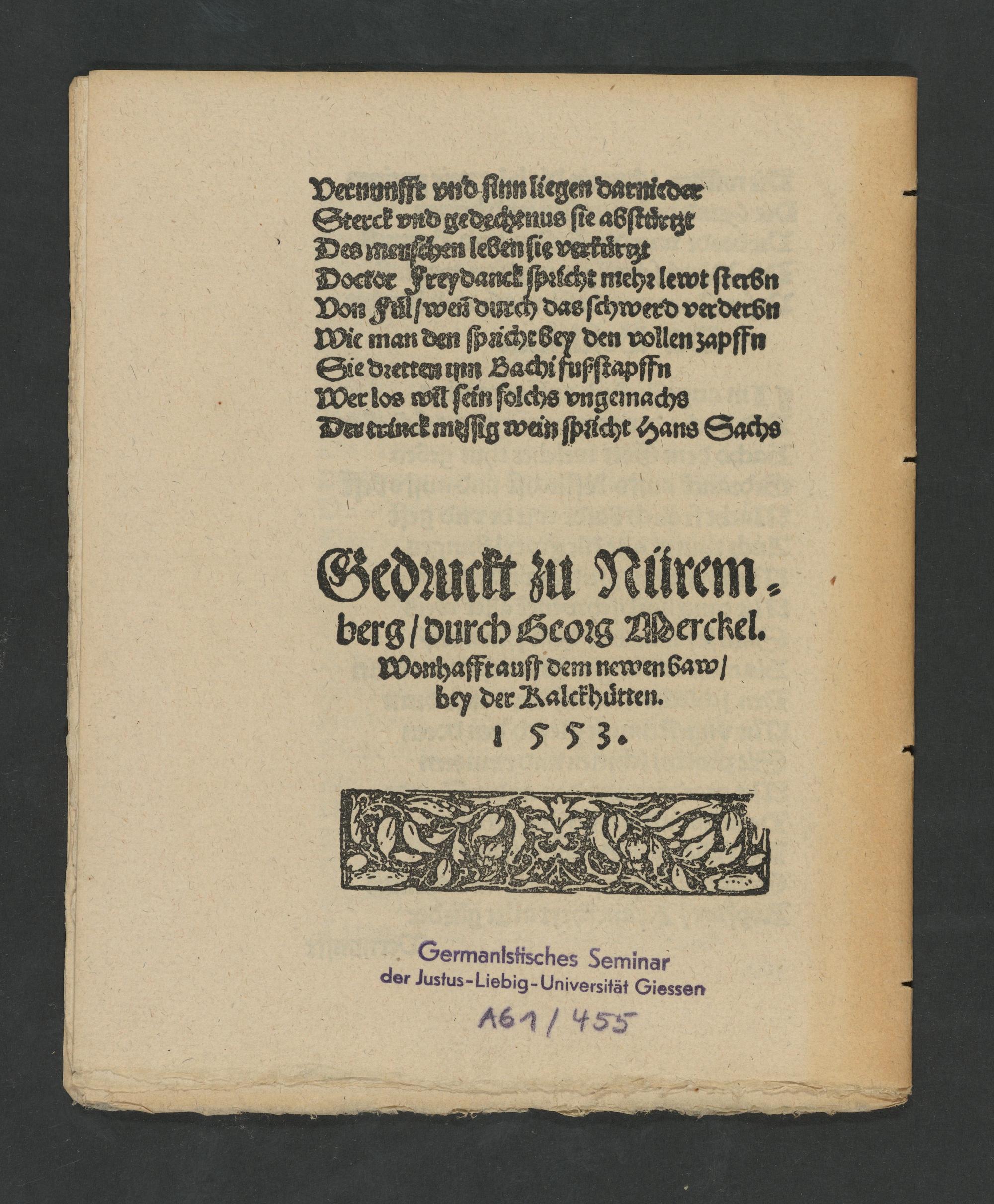 Veruon vnd ſiun liegen darnieder S erck M gedechenus ſie abſtuͤrtzt SMagn 2 1 leben ſie Ver urs Doctor Freydanck ſpꝛlcht mehꝛ lewt ſtersn Von Fuͤl wes ãdurch das ſchwerd verderbn e n Des ſpucheß den vollen zapffn Sie dꝛetten tun Bachi ſlßſtapffn Wer los wil ſein folchs vngemachs Den erinck miſſig wein ſpꝛicht ans Sachs