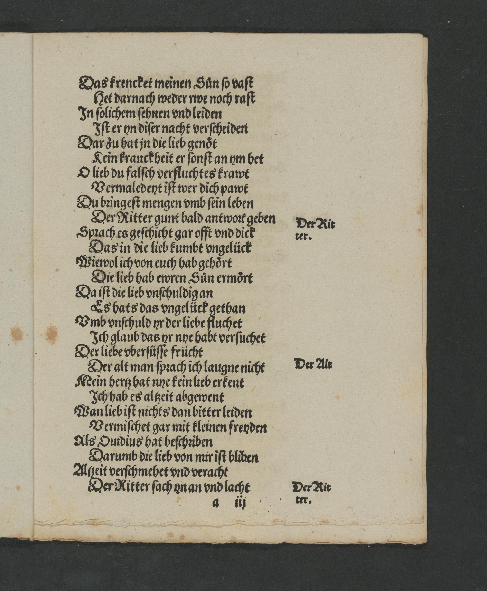 Spꝛach es geſchicht gar offt vnd dick Das in die lieb kumbt vngelück Wiewol ich von euch habgehoͤrt ‚Die lieb hab ewren Huͤn ermoͤrt Da iſt die lieb vnſchuldigan cos hats das vngelück gethban Vwb vnſchuld yr der liebe duchet Ich glaub das yr nye habt verſuchet Der liebe vberſüſſe frücht Seer alt man ſpꝛach ich laugne nicht Keein hertz hat nne kein lieb erkent Ich hab es altzeit abgewent Wan lieb iſt nichts dan bitter leiden Vermiſchet gar mit kleinen freyden Als Ouidius hat beſchꝛiben Darumb die lieb von mir iſt bliben Altzeit verſchmehet vnd veracht der Ritter ſach vn an vnd lacht