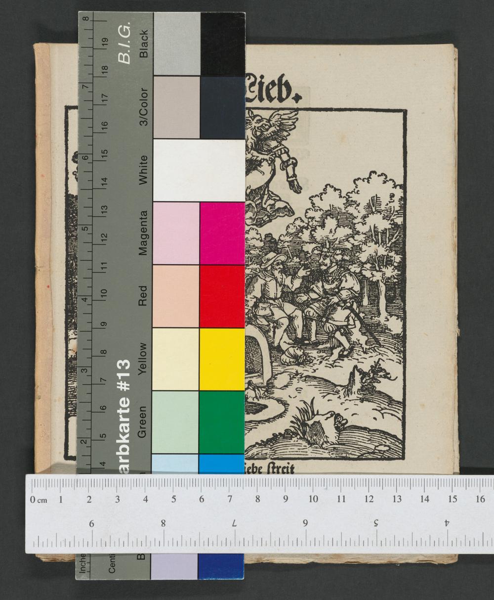 Von der Lieb. Jch bin genant der liebe streit Sag von der liebe wuñ vnd freyt Dar zu von schmertz vnd trawrickeit So in der lieb verporgen leit.