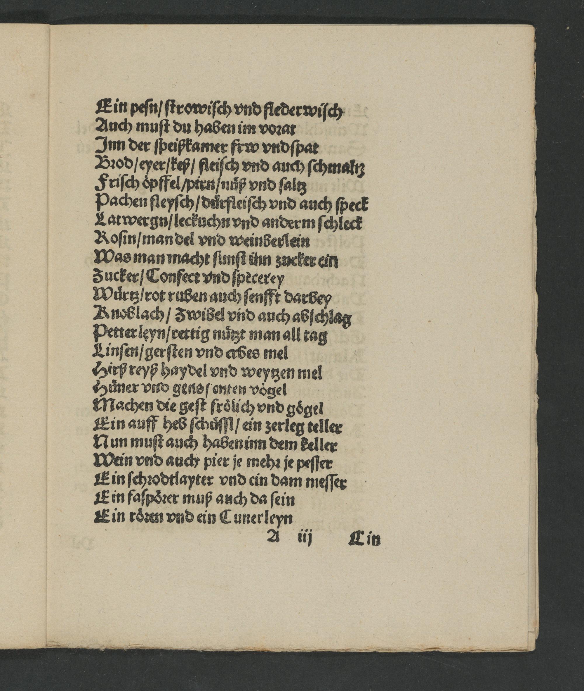 Ein peſn/ ſtrowiſch vnd flederwiſch Auch muſt du haben im voꝛat b Inn der ſpeißkamer frw vndſpat Bꝛod/ eyer ſkeß/ fleiſch vnd auch ſchmalt Friſch opffel/ pirn/ nuͤß vnd ſaltzʒ