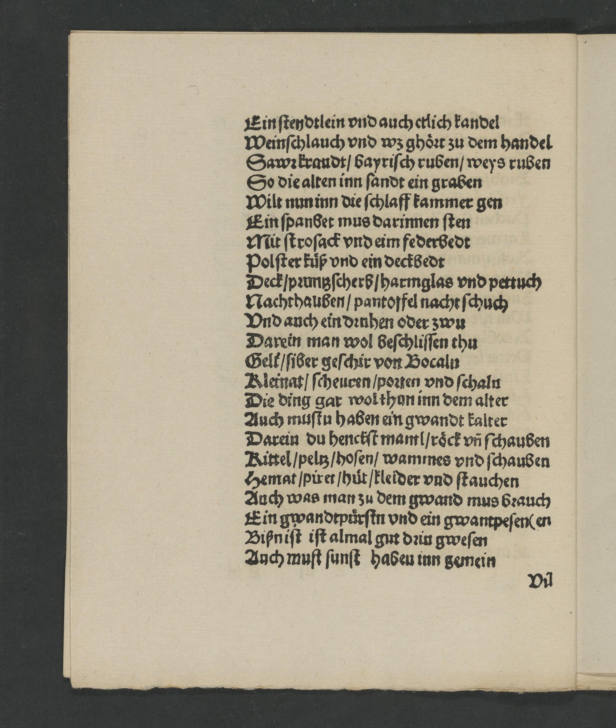 Die ding gar wolthyn inn dem alter Auch muſtu habzen ein gwandt kalter Darein du henciſt mam l/ roͤck vñ ſchauben Kittel/ peltz/ hoſen/ wammnes vnd ſchausen Hemat piret huͤt/ kleider vnd ſtauchen Auch was man ʒu dem gwand mus bꝛauch Ein gwandtpuͤrſin vnd ein gwantpeſen en Bißniſt iſt almal gut dꝛin gweſen