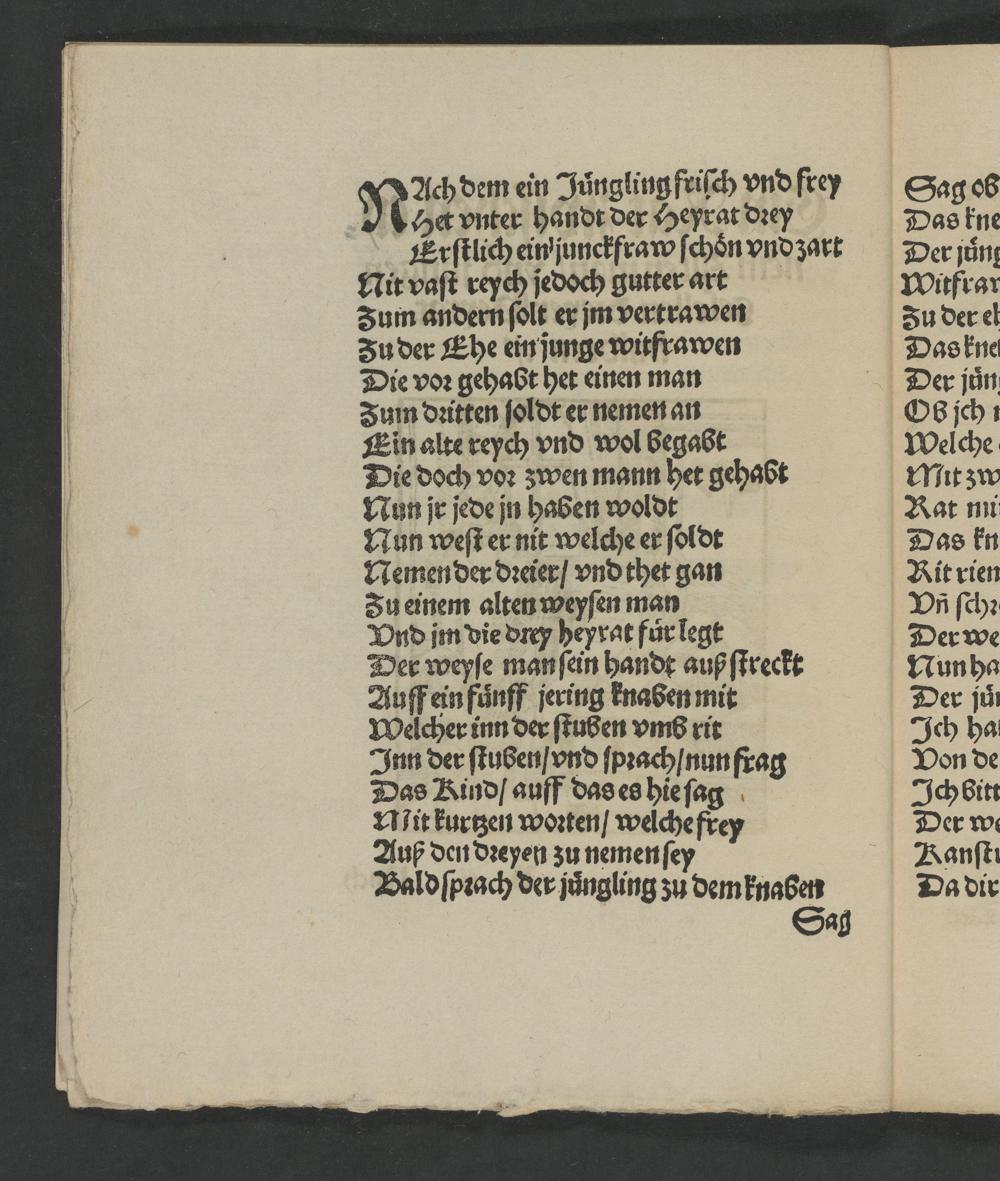 Mit vaſt reych jedoch gutter art Zum andern ſolt er jm vertrawen Zu der Ehe ein junge witfrawen Die voꝛ gehabt het einen man Zum dꝛitten ſoldt er nemen an Ein alte reych vnd wol begabt Die doch voꝛ zwen mann het gehabt Nun jr jede jn haben woldt Nun weſt er nit welche er ſoldt Nemen der dꝛeier/ vnd thet gan Zu einem alten weyſen man Vnd im die dꝛey heyrat fuͤr legt Der weyſe man ſein handt auß ſtreckt Auff ein fuͤnff jering knaben mit Weicher inn der ſtußen vmb rit Inn der ſtuben/ vnd ſpꝛjach/ nun frag Das Kind/ auff das es hie ſag Nit kurtzen woꝛten/ welchefrey Auß den dꝛeyen zu nemenſey Bald ſpꝛach der juͤngling zu dem knaben Sag