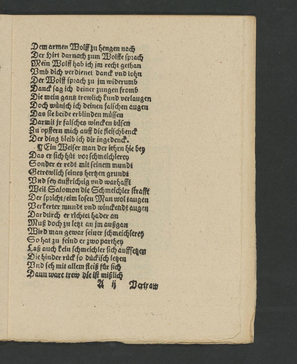 CEin Weiſer man der lehrn hie bey Das er ſich huͤt voꝛ ſchmelchlerey Sonder er rede mit ſeinem munde Getrewlich ſeines hertzen grundt Vnd ſey auffrichrig vnd warhafft Weil Salomon die Schmeichler ſtrafft Der ſpꝛicht/ eim loſen Man wol taugen Verkerter mundt vnd winckendt augen Dardurch er richtet haderan Muß doch zu letzt an jm außgan Wird man gewar ſeiner ſchmeichlere⸗ So hat zu feind er zwo parthey Laß auch kein ſchmeichler ſich auffſetzen Die hinder ruͤck ſo duͤckiſch letzen Und ſeh mit allem fleiß fuͤr ſich Dann ware trew dle iſt mißlich A TDarratt