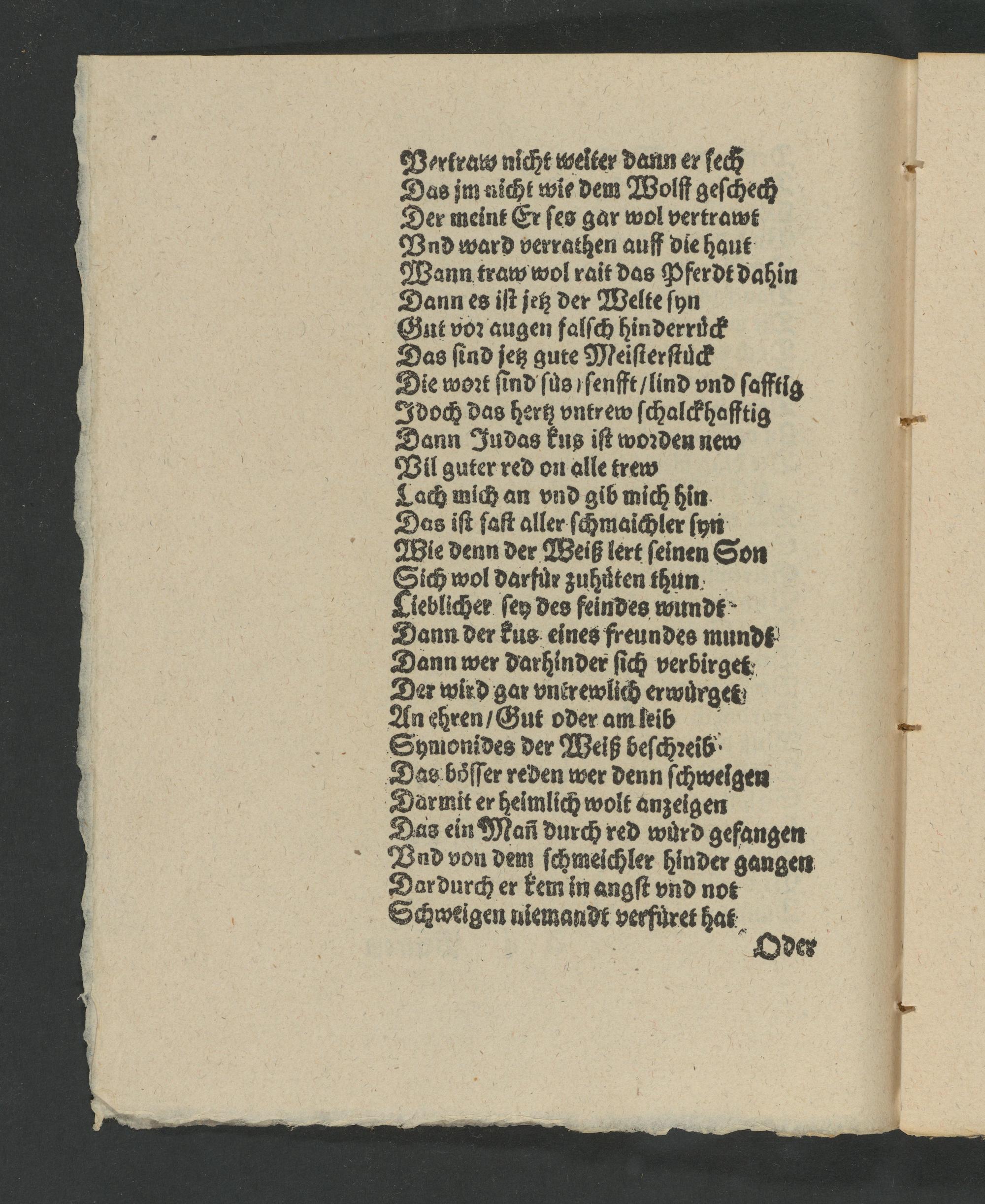 Beriraww nicht welter dann er ſech Das jm nicht wie dem Wolſt geſchech Der meint Er ſes gar wol vertrawt Pnd ward verrathen auff die haut Wann traw wol rait das Pferdt dahin Dann es iſt jetz der Welte ſyn Gut voꝛ augen falſch hinderruͤck Das ſind jetz gute Meiſterſtuͤck Die woꝛt ſind ſus ſenfft/ lind vnd ſafftig Idoch das hertz vntrew ſchalckhafftig Dann Judas kus iſt woꝛden new Vil guter red on alle trew Lach mich an vnd gib mich hin Das iſt ſaſt aller ſchmaichler ſyn Wie denn der Weiß lert ſeinen Son ich wol darfuͤr zuhuͤten thun