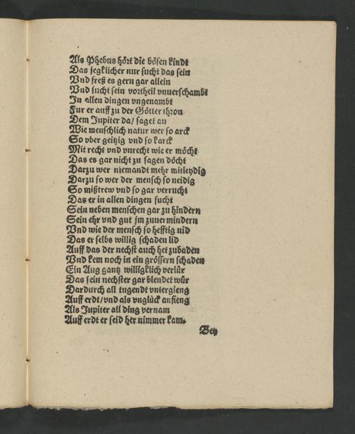 So mißtrew vnd ſo gar verrucht Das er in allen dingen ſuchh Sein neben menſchen gar zu hindern Sein ehr vnd gut jm zuuermindern Vnd wie der menſch ſo hefftig nid Das er ſelbs willig ſchaden lid Auff das der nechſt auch het zubaden Pnd kem noch in ein groͤſſern ſchaden Ein Aug gantz willigklich verluͤr Das ſein nechſter gar blendet wuͤr Dardurch all tugendt vntergieng Auff erdt/ vnd als vngluͤck anſieng Als Jupiter all ding vernͤam Auff erdt er ſeid her nimmer kam.