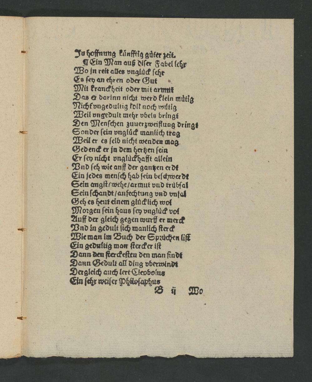 Ju hoffnung kuͤnfftig guͤter zeit. Ein Man auß diſer Fabel lehr Wo in reit alles vngluͤck ſeche Es ſey an ehren oder Gut Mit kranckheit oder mit arumnk Das& darinn nicht werd klein muͤtig Nichk vngedultig kolk noch wuͤtlg Weil vngedult mehr vbels bringt Den Menſchen zuuerzweiflung dringt Sonder ſein vngluͤck manlich trag Weil er es ſelb nicht wenden mag Gedenck er jn dem hertzen ſeen Er ſey nicht vngluckhafft allein Vod ſeh wie anff der gantzen erdt Ein ſedes menſch hab ſein beſchwerdt Seln angſt’/ wehe/ armut vnd truͤbſal Sein ſchandt/ anfechtung vnd vnfal Geh es heut einem gluͤcklich wol Moꝛgen ſein haus ſey vngluͤck vol Auff der gleich gegen wurf er merc Vnd in gedult ſich manlich ſterck Wie man im Buch der Spꝛuchen liſt Ein gedultig man ſtercker iſt Dann den ſterckeſten den man finde