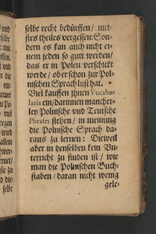 niſchen Sprach luſt hat. Viel kauffen jhnen Vocabu⸗ laria ein/ darinnen mancher⸗ ley Polniſche vnd Teutſche Phraſes ſtehen/ in meinung die Polniſche Sprach da⸗