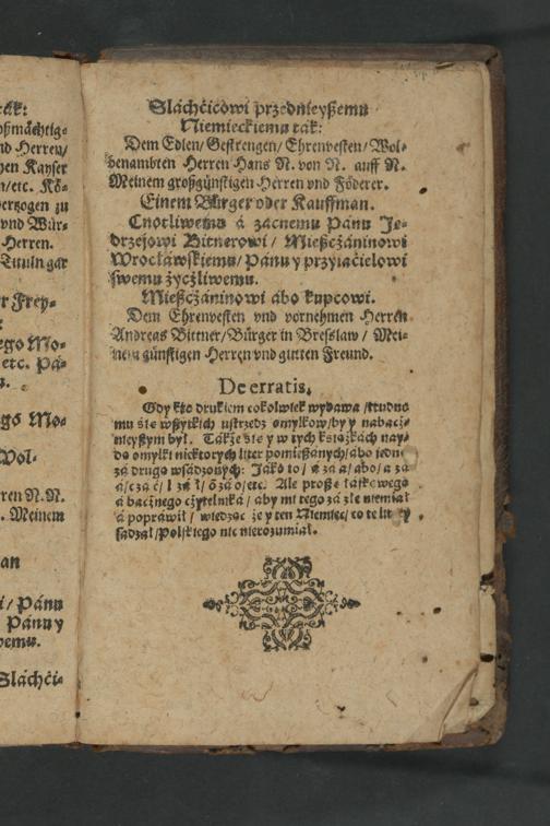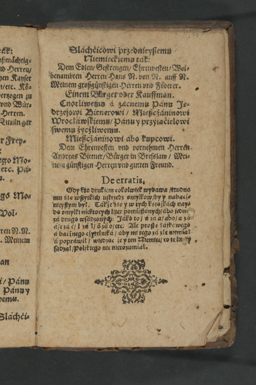 Einem Burger oder Kauffman. Cunotliwemas a zacnemu Pann Je⸗ drzejowi Nitnerowi/ Mießezaͤninowi Wroctawſkiemn/ Panuy przyiaeielowi ſwemu zyczliwemu.