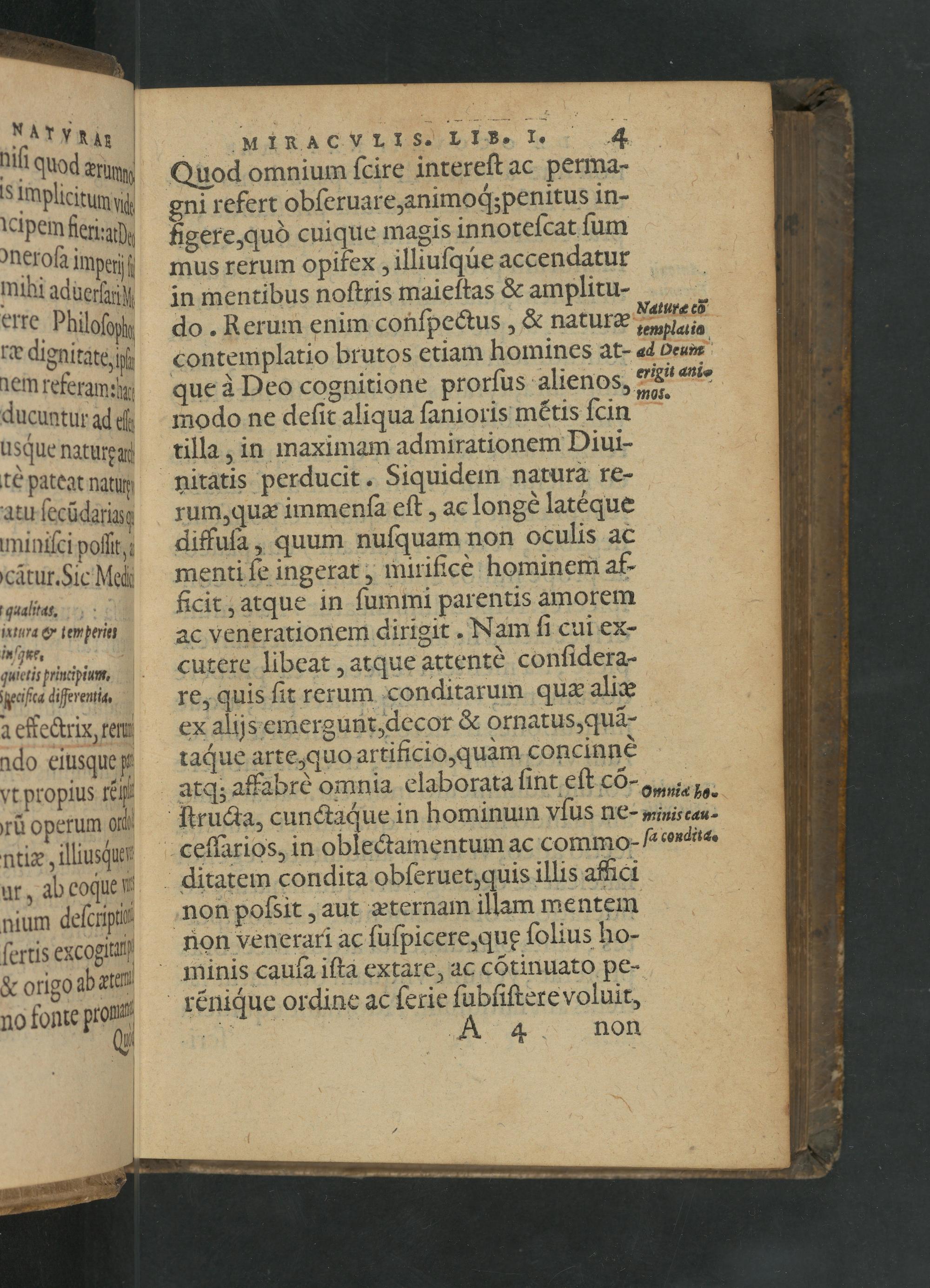 HIMIRACVILIS. IIB. I. 4 Quod omnium ſcire intereſt ac perma- gni refert obſeruare, animoq́;penitus in- nigere, quò cuique magis innoteſcat ſum mus rerum opifex, illiuſqùue accendatur in mentibus noſtris maieſtas& amplitu- do. Rerum enim conſpectus,& naturæ contemplatio brutos etiam homines at- que à Deo cognitione prorſus alienos modo ne deſit aliqua ſanioris mẽtis ſcin rilla, in maximam admirationem Diui-