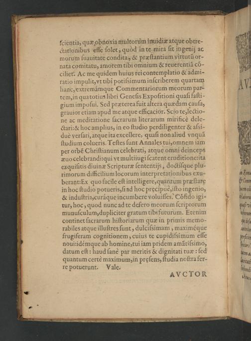 cilier. Ac me quidem huius reicontemplatio& admi- ratio impulit, vt tibi potiſsimum inſcriberem quartam hanc, extremàmque Commentariorum meorum par- tem, in quatotius libri Geneſis Expoſitioni quaſi faſti- gium impoſui. Sed præterea fuit altera quædam cauſa, grauior etiam apud me atque efficacior. Scio te, lectio- ne ac meditatione ſacrarum literarum mirificè dele- ctari:& hoc amplius, in eo ſtudio perdiligenter& aſsi-