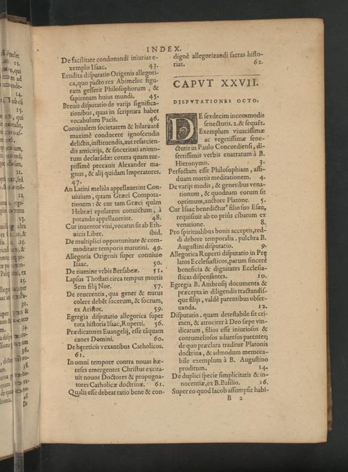 uiuium, quam Græci Compota- tionem:& cur tam Græci quàm BHebræi epularem conuictum, 4 porando appellauerint. 48. Cur inuentor vini, vocatus ſit ab Eth- nicis Liber. B ibid. De multiplici opportunitate& com- moditate temporis matutini. 49. Allegoria Origenis ſuper conuiuio