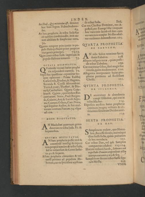 An illud, Qui mittendus eſt, denotet ſit tribui Iuda. Ibid. b 195 hoc loco regem Nabuchodono- Cur nec Chriſtus Dominus, nec A- 680 ſor. 69. poſtoli, nec Euangeliſtæ vmquam zerb An hæc prophetia de tribu Iuda fue hoc vaticinio lacob vſi ſint: cum b N w rit tantuͤm conditionalis, non au- eo vaticinio tempus Meſſiæ aduẽ- gf 9 tem abſoluta& ſimpliciter certa. tus euidenter demonſtretur. 105. 5 m 0. 8 Qhant⸗ tempore principatus in po- OQVARTA PROPHE TIA een pulo Hebręo fuerit penes proprios DE zABVLON. SAI eius gentis principes. 7273. Quot annis tribus Iuda imperium in N vrbs Sidon terminus fuerit populo Hebræo tenuerit. 73. ſortis Zabulon. 108. NEhbi Aliquot inſignia terræ, quàm poſſe- 11 ncem ocrAvA DISPVTATIo. dit tribus Zabulon. 109. Msgia e Vomodo veritati huius prophe Cur maritimæ Gétes, ferè magis ſint it tie reſponderit euentus. 72. vitioſæ, quàm mediterranæ. 110. De nolek d Super hac quæſtione exponũtur no- Allegorica interpretatio huius pro- aotngee uem opiniones: Prima Euſebij Phetiæ pertinens ad Eccleſiam h Cæſarienſis, Diodori,& Hugonis. Chriſti. 111. Dermenar Secunda B. Cyrilli Alexandrini. luopbein Tertia Lyrani, Thoſtati,& Dio- QVINTA PROPH ETIA. nyſij Carthuſiani. Quarta Gene- DE ISSACHAR. AMM brardi. Quinta, quorundam Re- centiorum. Sexta, Pauli Burgen- D' amœnitate& abundantia ſis, Galatini, Anij& Lucidi. Septi- campi Eſdrelon, qui erat in F* ma Caietani. Octaua, Cani. Nona, tribu Iſſachar. 114. 2 quã ſequitur Auctor,& fuit mul- Expoſitio myſtica huius prophetiæ torum vererum Patrum. 74.:vſque continens magnę vtilitatis& cõ- NON. adIoc. ſolationis ſeruorum Dei documẽ- D . ta. 119. NoNA DISPVTATIO. b T SEXTA PROPHETIA. te. A N Machabæi paternum genus D E DAN. pui duxerint ex tribu Iuda. 81.& gun ſequentibus. Omplanen eodem, quo Hercu- ſtesl ₰ lem, floruiſſe ſeculo; maioraque tione DECIMA DISPVvTATIoO- illius fuiſſe facta, quàm poëtarum llegor N hæec prophetia poſſit ver?& de hoc mendacia. 121. pdeti⸗ 1 commodè intelligi& exponi Cur tribus Dan, vel ipſe Sampſon iß. non propriè tantùm de tribu luda, comparetur colubro. 123.124. Sd in vniuerſum de Gente Iudai- Illorum verborũ lacob, Salutare tui Nn