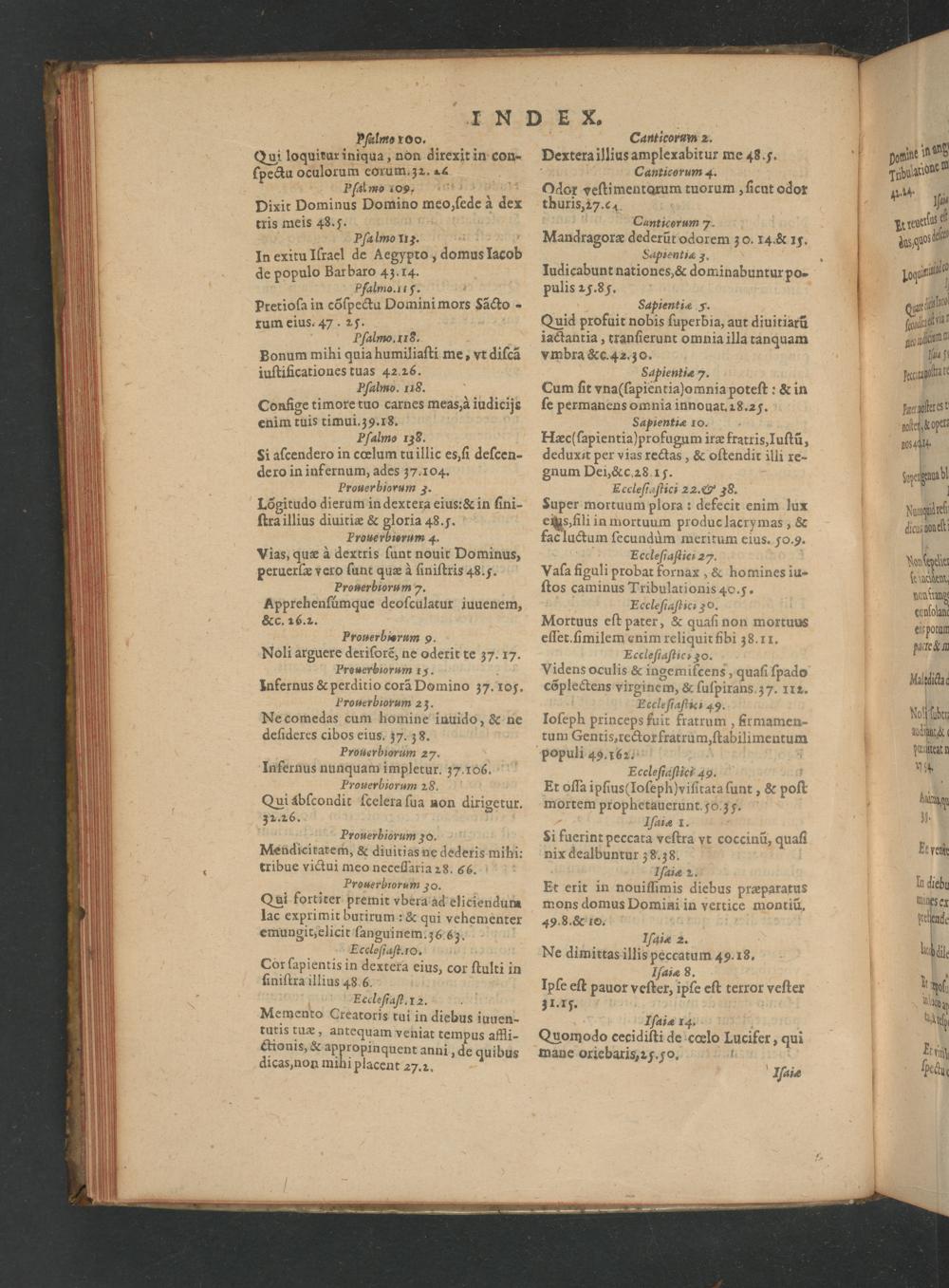 Canticorum 2. Dextera illius amplexabitur me 48.5. Canticorum 4. Odor veſtimentarum tuorum, ſicut odor thuris, 27.4 1 Canticorum 7. Mandragoræ dederũt odorem z0. 14.& 19. Saplentix 3. Iudicabunt nationes,& dominabuntur po- pulis 25. 85. Sapientiæ y. Quid profuit nobis ſuperbia, aut diuitiarã iactantia, tranſierunt omnia illa tanquam vmbra&c. 42.30. Sapientiæ 7. Cum ſit vna(ſapientiaſomnia poteſt:& in ſe permanens omnia innouat. 18.25. Sapientiæ 10. Hæc(ſapientia)profugum iræ fratris, Iuſtũ, deduxat per vias rectas,& oſtendir illi xe- gnum Dei,& c. 28, 15. Eecleſiaſtici 22. G 38. Super mortuum plora: defecit enim lux eigs, fili in mortuum produc lacry mas,& fac luctum ſecundum meritum eius. 50. 9. Eccleſiaſtics 27. Vaſa figuli probat fornax,& homines iu- ſtos caminus Tribulationis 40.5. Eccleſiaſticz 30. Mortuus eſt pater,& quaſi non mortuus eſſet. ſimilem enim reliquit fibi 38. 11. Eeccleſtaſtic: 30. Videns oculis& ingemiſcens, quaſi ſpado cõplectens virginem,& ſuſpirans. 37. 112. Eccle ſiaſtic; 49. Ioſeph princeps fuit fratrum, Ermamen- tum Gentis, rector fratrum, ſtabilimentum populi 49.162. V 8 Eccleſiaſtici 49. Et oſſa ipſius(Ioſeph)viſitata ſunt,& poſt mortem prophetauerunt. 5o. 35. Iſaiæ I. Si fuerint peccata veſtra vt coccinũ, quaſſ nix dealbuntur 38.;38. Iſaiæ 2. Et erit in nouifſimis diebus præparatus mons domus Domini in vertice montiũ. 49.8.& 10. Iſaiæ 2. Ne dimittas illis peccatum 49.13. Iſaiæ 8. Ipſe eſt pauor veſter, ipſe eſt terror veſter 31.15. 3 Iſaiæ 14.. Quomo do cecidiſti de cœlo Lucifer, qui mane oriebaris, z5.)o. 4. Naiæ