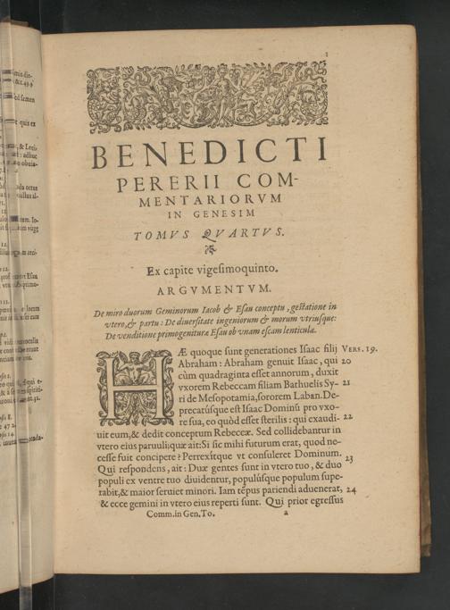 & Abraham: Abraham genuit Iſaac, qui 20 cùm quadraginta eſſet annorum, duxit vxorem Rebeccam filiam Bathuelis Sy- 21 ri de Meſopotamia, ſororem Laban. De- 98. 3 Lo precatuſque eſt Iſaac Dominũ pro vxo- 57² A ʒ re ſua, eo quòd eſſet ſterilis: qui exaudi- ²² 4, 1 oda- uit eum,& dedit conceptum Rebeccæ. Sed collidebantur in vtero eius paruuliquæ ait: Si ſic mihi futurum erat, quod ne- ceſſe fuit concipere? Perrexitque vt conſuleret Dominum., Qui reſpondens, ait: Duæ gentes ſunt in vtero tuo,& duo 3 populi ex ventre tuo diuidentur, populuſque populum ſupe- rabit,& maior ſeruiet minori. Iam tẽpus pariendi aduenerat, 24 & ccce gemini in vtero eius reperti ſunt. Qui prior egreſſus Comma in Gen. To. a