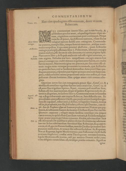 num, virginalem continentiam purè conſeruauit. Neque S enim fas eſt putare, ſanctiſſimum iuuenem, vllam illicitæ Aetas idonea= voluptati operam dediſſe ante coniugium. Commenda- voniugio. tur præterea, exemplo Iſaac, tempus hominis maturum, ætaſque matri- monio tempeſtiua. A qua ætate proximè abeſt xtas, quam Ariſtoteles coniugio præſcripſit, affirmans libro 7. Politicorum, idoneam coniugio ætatem mulieris, eſſe decem& octo annorum viri autem, triginta ſeptẽ. plats. Plato autem libro.de Repub. mulierem vult eſſe viginti annorum, vi- Heſiodus. rum triginta. Heſiodus æsel kνν, tempeſtiuam coniugio ætatem fore G putat, ſi coniuges nec multo minores trigeſimo anno fuerint, nec multo fuerint maiores. Matrimonia igitur nec præcocia, nec ſera nimis eſſe cõ- uenit: magna enim vtrimque proueniunt incommoda, quæ Ariſtoteles