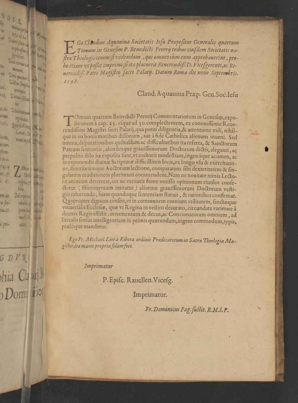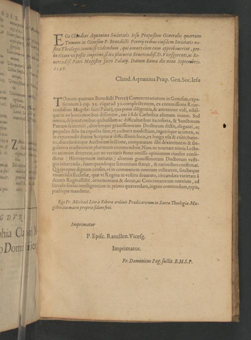 00 Clsidius Aquauiua Societatis leſu Præpoſitus Generalis quartum E Tomum in Geneſim P. Benedicti Pererij tribus einſdlem Societatis no- 5.. N..