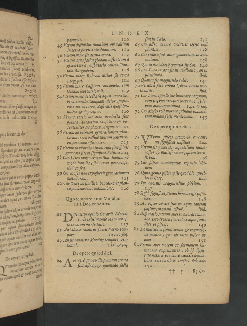 E X. undi triduo lux ila nis 2otuenek.— Haun J lium 65 Afuuhr Cea. e voluerit Deus 37 tierun E nocium 95 49 Vtrum diſtinctio zontium G ium 65 1, Nira ercare Voli 6 4 one Ae,tnnſgtanh ennt in terra fuerit ante diluuium. 112 † antar. 1 3 e G retractionem ſal. 50 Vtrum mare ſit altius terra. 113 66(ur creata ſint ante generationem ani- Niyt ſignifcat Baſtlin.dd. 1 Vtrum aqua faciat globum diſtinctum à malium. 138⁸ loco ealux creata ſit. 8 globo terræ, diſputatio contra Pau- 6 7 Quoto die Martij creatus ſit Sol. 140 undus fuerit tenehraſis, lum Burgenſem. 116 68 An Luna creata ſit in nouilunio, an in m lurx creata ſit. 839 8 52 Vtrum mare Rubrum altius ſit terra Pꝓplenilunio. ihid. dxerit factum eſſe veſbere Aeg ypti. 1 14 69 Quanta ſit magnitudo Solis. 141 e diem vnum,& non diem 53 Vtrum mare Caſpium continuetur cum o Lrum à ſole omnia ydera lucem mu- 879 8K Oceano ſeptentrionali. 119 tuentur. ibid. AMoſes nominauerir ehen 54 Vtrum prius detecta ſit aquis terra Se- 71 Cur Luna appelletur luminare magnusm, aane. 1 ptentrionalis tanquam altior, poſle- cum ſit, vno excépto Mercurio, ſyde- mundi diem fuiſſe eum, quih.. rius autem terra Auſtralis quaſi hu- rum ommum minima. 142.& ſeg. dellatus eſt Dominicus nului milior& depreſſior. 1 20 72 Cur Moſes reliquorum quinque planeta- eclaris nobilitatus prargg- 55 Vtrum tertio die attu produétæ ſint rum nullann fecit mentionem. 143 8 plantæ, antantum cauſaliter& po- tentialiter, vt placet Auguſtino. 1 22 De opere quinti diei. pus ſecundi diei. 56 Vtrum ad brimam gencraiionem plan- 8 1* tarum rerra paſſius tantum conturre- 73 Trum Piſces memorla carcant, Awncahulb kirmaneni ita- rit, an etiam eſicienter. 12²3 vt ſignificat Baſilius. 144 13 uedei vymn 1 57 Vtrum in exordio Mundi roſa ſine ſpinis 74 Vtrum ſit generatio aquatilium nume- ugerdum ſit, an telmex, gSenerata ſit, vt ſignicat Baſilius. 24 roſior& multiformior, qudm terre- ſebbosTheodoreto, beie, ſß 88 cur à Deo multa creuta ſunt homini nõ ſtrium. 146 ait,vel ex akre, vi 2uſiio nſi b mpoqdo inutilia, ſed etiam pernicioſa. 75 Cur piſces nominentur reptilia. ibi- wuupactum dan aliud quphim. iid.& ſeq. b dem & ſeq. neli 59 Cur Moſes non expoſuerit generationem 76 Quod genus piſcium ſit quod hic appel- aqus ſuper cœlos doſita: cj metallorum. 1 25 laatur(ete. ibid. 14 ſänt Dirttualite,an corpor 6o Cur Deus nõ ſimiliter benedixerit plan- 77 De enormi magnitudine piſcium. aſputatio cum Origenc. 3 i⸗, vt beneaixit animalibus. 1 26 147. oer cœlos jdereos ſtn nar 278 Quid ſignificet, Deum benedixiſſe piſci- rales aqus, yt multis Pan. Quo tempore anni Mundus ns. 148 de 98.0 ſit à Deo conditus. 79 An piſces creati ſint ex aqua tantum uun. ai ſui ardoris tempenien— paſgiue, an etiam actiuc. ibid. nſcenaa⸗ udigeant refribenum 61 Mutitur opinio Gerardi Merca- do Diſputatio, vtrum aues in exordio mun- adpaſtun 8 duo. 101110) toris exiſtimantis Mundum eſ- di a Deo creatæ fuerint ex aqua ſimi- diua,nel leſes nnelg ſe creatum menſe Iulio. 127 liter vt piſces. 149 per acuds i lund 1030 1 62 An Müdus conditus fuerit Verno tem- 81 De multiplici ſimilitudine& cognatio- cbeat cin Sjes uandiuun pore. 1 27.& ſeq. ne naturæ, quæ oſt inter piſces& er aqfuds da uam tquat mum 63 An ſit conditus Mundus tempore Au- aues. 151 gere eporten q tunani. 130.& ſeq. 82 Ptrum aues vocem&r ſermonem hu- Ae zmacre generan manum exprimentes, ob id digni- T tetettijdieci. De opere quarti dici. tate naturæ præſtare cunctis anima- De oper- us oei 64 A verè quarto die primum creata libus terretribus cenſeri debeant. tc noGt 152² 3