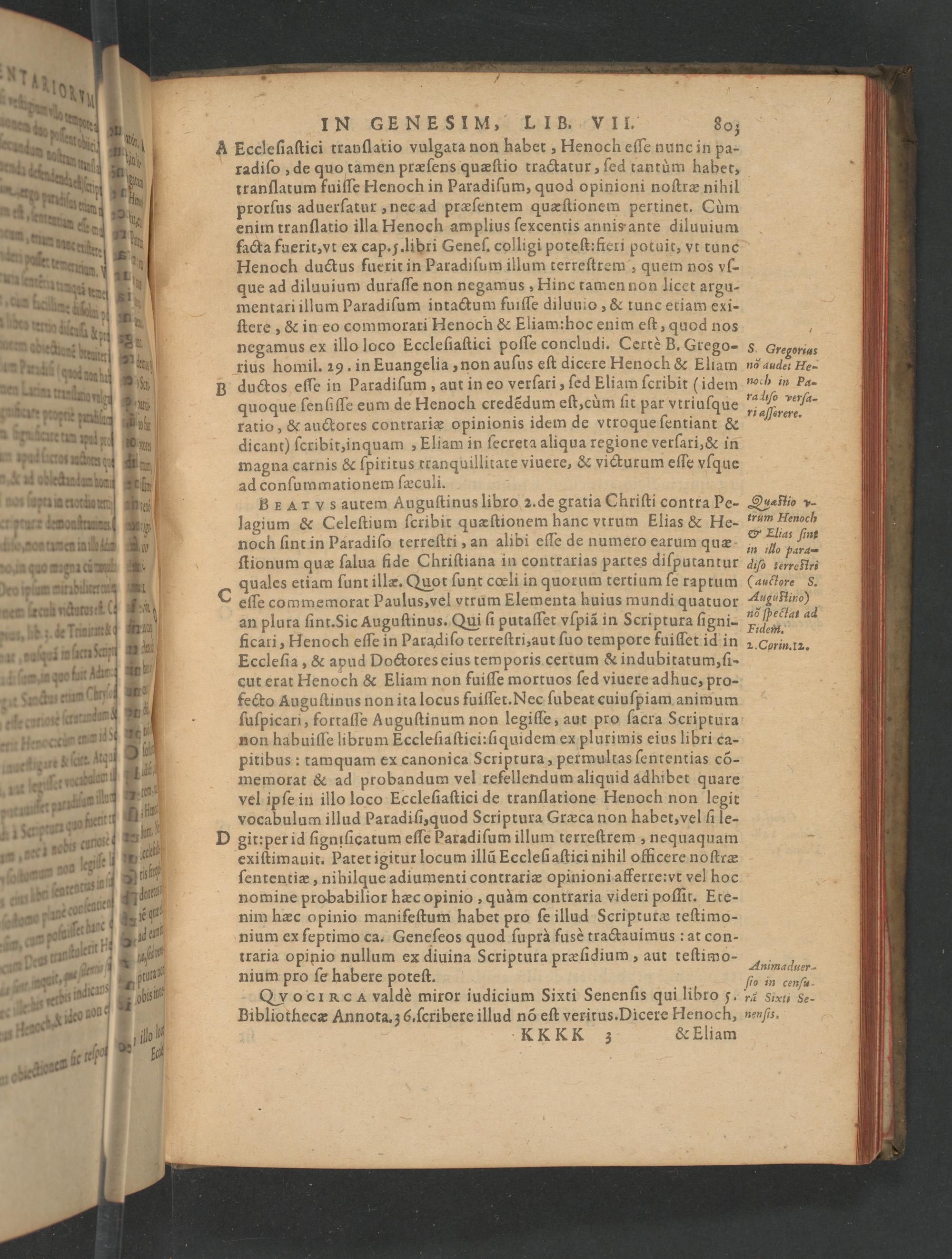 BEATVS autem Auguſtinus libro 2. de gratia Chriſti contra Pe- lagium& Celeſtium ſcribit quæſtionem hanc vtrum Elias& He- noch ſint in Paradiſo terreſtti, an alibi eſſe de numero earum quæ ſtionum quæ ſalua fide Chriſtiana in contrarias partes diſputantur quales etiam ſunt illæ. Quot ſunt cœli in quorum tertium ſe raptum eſſe commemorat Paulus, vel vtrum Elementa huius mundi quatuor an plura ſint. Sic Auguſtinus. Qui ſi putaſſet vſpiã in Scriptura ſigni- ficari, Henoch eſſe in Paradiſo terreſtri, aut ſuo tempore fuiſſet id in Eccleſia,& apud Doctores eius temporis certum& indubitatum, ſi- cut erat Henoch& Eliam non fuiſſe mortuos ſed viuere adhuc, pro- fecto Auguſtinus non ita locus fuiſſet. Nec ſubeat cuiuſpiam animum ſuſpicari, fortaſſe Auguſtinum non legiſſe, aut pro ſacra Scriptura non habuiſſe librum Eccleſiaſtici: ſi quidem ex plurimis eius libri ca- pitibus: tamquam ex canonica Scriptura, permultas ſententias cõ-