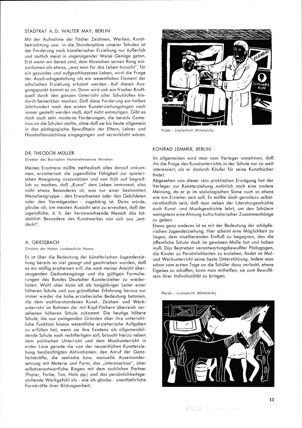 Es ist öber die Bedeutung der könstlerischen Jugenderzie- hung bereits so viel gesagt und geschrieben worden, doß es mir mößig erscheinen will, die nach meiner Ansicht öber- zeugenden Gedankengänge und die göltigen Formöolie- rungen des Bundes Deutscher Kounsterzieher zu wieder- holen. Wohl aber kann ich als langjähriger Leiter einer höheren Schule und dus gröndlicher Erfahrung heraus nor immer wieder die hohe erzieherische Bedeutung betonen, die dem wohlverstandenen Kunst-, Zeichen- und Werk- onterricht im Rahmen der mit Kopf-Fächern öberreich ver-— sehenen höheren Schule zokommt. Die heufige höhere Schole, die dus zwingenden Grönden öber ihre onterricht-— liche Funktion hindus wesentliche erzieherische Aufgaben zu erföllen hat, wenn sie ihre Existenz als allgemeinbil- dende Schuöle noch rechtfertigen soll, braucht hierzu neben dem politischen Unterricht und dem Möosikonterricht in erster Linie gerade die von der neuzeitlichen Kunsferzie- hong beabsichtigten Aktivationen: den Anruf der Ganz-— heiftskräfte, die seelische bzw. mandelle Auseinander-— setzung mit Materie und Form, dos„interesselose“, aber selbstverantwortliche Ringen mit dem sachlichen Partner (bapier, Farbe, Ton, Holz pp.) und das persönlichkeifsge- staltende Werkgeföhl als-wie ich glaube- unentbehrliche Formkräfte ihrer Bildungsarbeit.