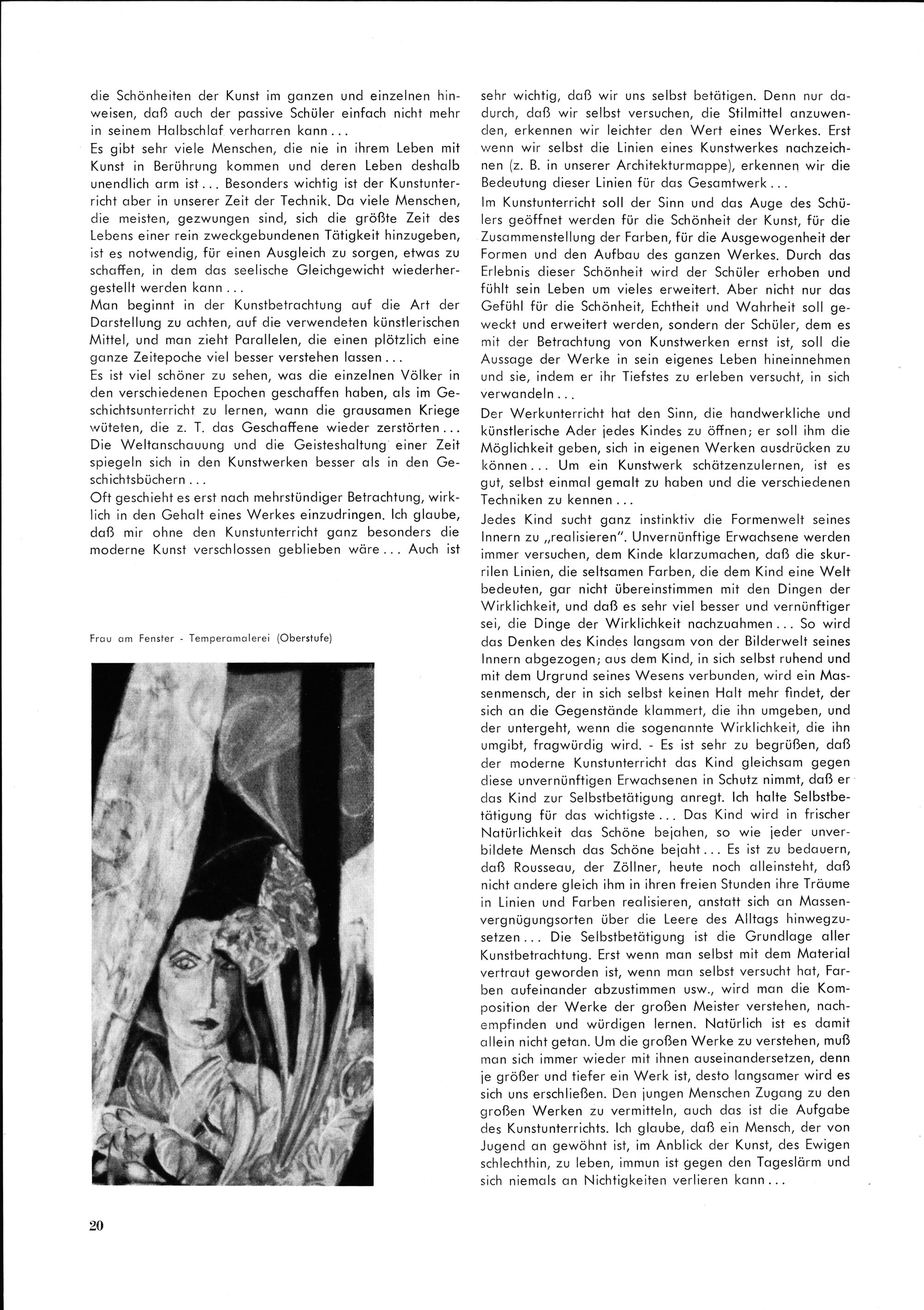 Es gibt sehr viele Menschen, die nie in ihrem Leben mit Kunst in Beröhrung kommen ond deren Leben deshalb vnendlich arm ist... Besonders wichtig ist der Kunstunter-— richt aber in onserer Zeit der Technik. Do viele Menschen, die meisten, gezwöngen sind, sich die größte Zeit des Lebens einer rein zweckgebundenen Tätigkeit hinzugeben, ist es notwendig, för einen Ausgleich zu sorgen, etwos zu schaffen, in dem das seelische Gleichgewicht wiederher-— gestellt werden kann...