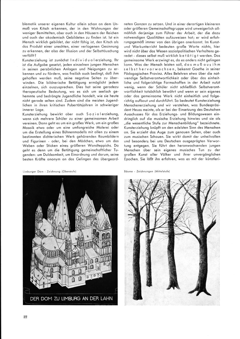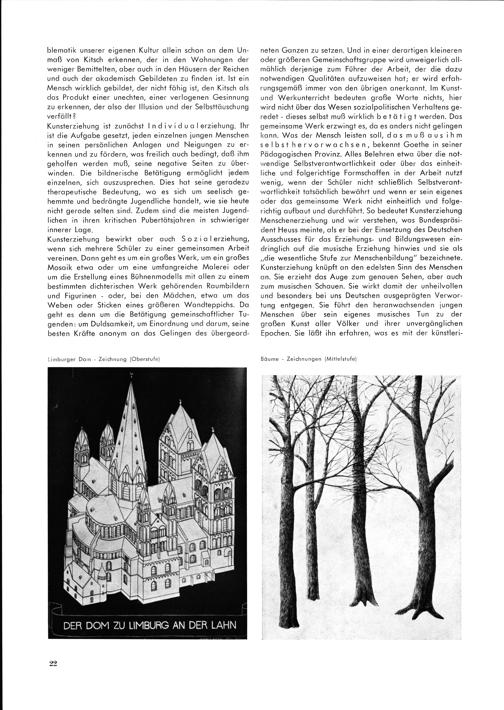Kunsterziehung bewirkt aber duch Sozid lerziehung, wenn sich mehrere Schöler zu einer gemeinsamen Arbeit vereinen. Dann geht es um ein großes Werk, um ein großes Mosdik etwa oder um eine umfangreiche Malerei oder om die Erstellong eines Böhnenmodells mit allen zu einem bestimmten dichterischen Werk gehörenden Roumbildern ond Figurinen- oder, bei den Mädchen, efwa um das Weben oder Sticken eines größeren Wandteppichs. Do geht es denn um die Betätigung gemeinschaftlicher Tu-— genden: um Doldsamkeit, um Einordnung und darum, seine besten Kräfte anonym an das Gelingen des öbergeord-