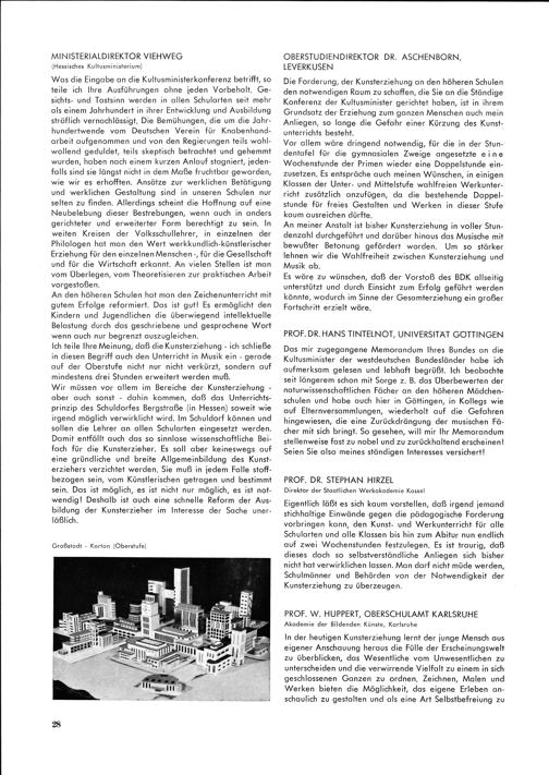Die Forderung, der Kunsterziehung an den höheren Schölen den notwendigen Raum zu schaffen, die Sie an die Ständige Konferenz der Kultosminister gerichtet haben, ist in ihrem Grondsatz der Erziehung zum ganzen Menschen duch mein Anliegen, so lange die Gefahr einer Körzung des Kunst-— onterrichts besteht.