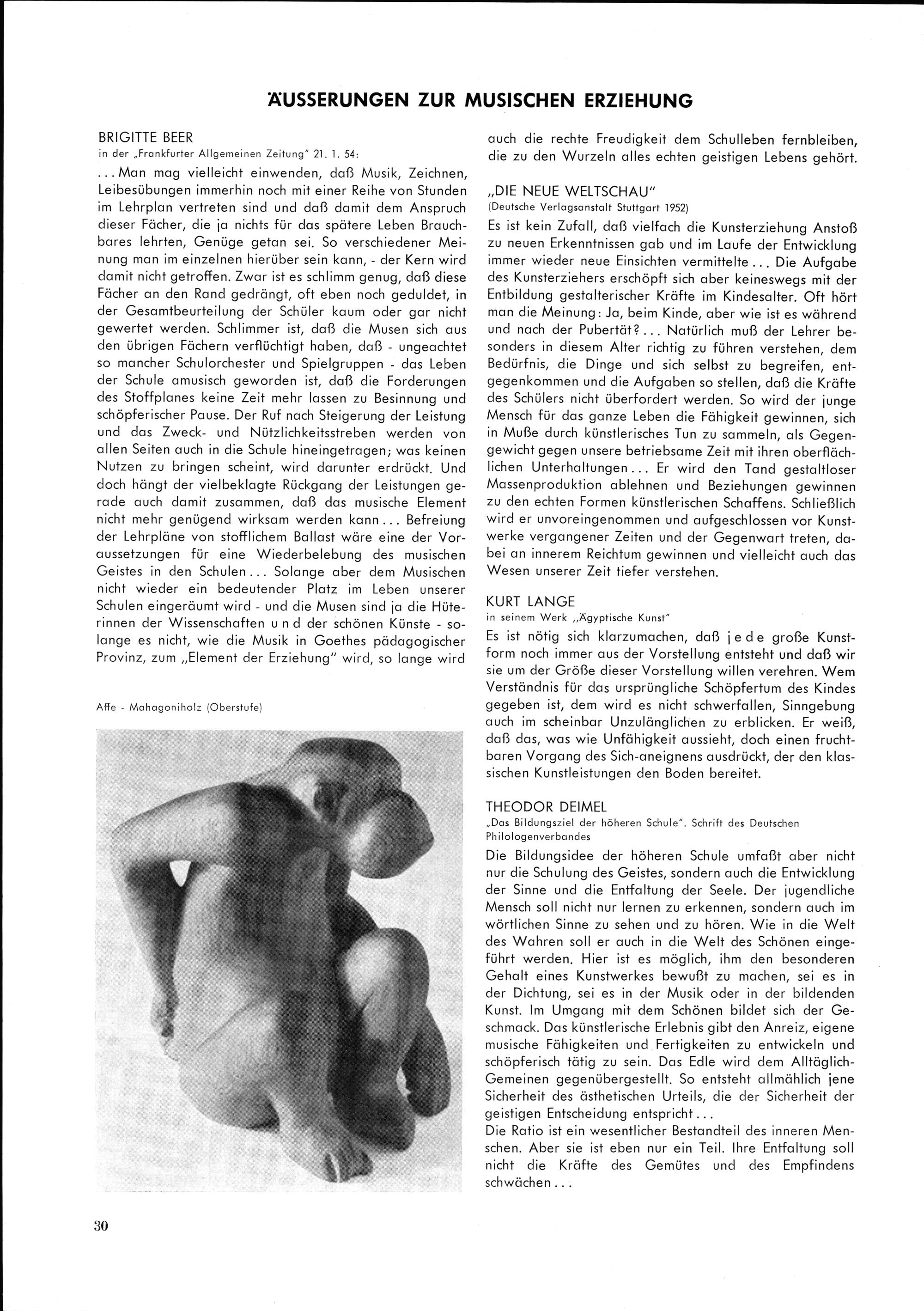 Es ist kein Zufall, daß vielfach die Kunsterziehung Anstoß zu neuen Erkenntnissen gab und im Laufe der Entwicklung immer wieder neue Einsichten vermittelte... Die Aufgabe des Kunsterziehers erschöpft sich dber keineswegs mif der Enibildung gestalterischer Kräfte im Kindesalter. Oft hört man die Meinung: Ja, beim Kinde, aber wie ist es während ond nach der Puberfät?... Natörlich möß der Lehrer be- sonders in diesem Alter richtig zu föhren verstehen, dem Bedörfnis, die Dinge und sich selbst zu begreifen, ent- gegenkommen und die Aufgaben so stellen, daß die Kräfte des Schölers nicht öberfordert werden. So wird der jonge Mensch för das ganze Leben die Fähigkeit gewinnen, sich in Moße durch könstlerisches Tun zu sammeln, als Gegen— gewicht gegen unsere betriebsame Zeit mit ihren oberfläch- lichen Unterhaltungen... Er wird den Tand gestaltloser Massenprodoktion ablehnen und Beziehungen gewinnen zu den echten Formen könstlerischen Schaffens. Schließlich wird er unvorsingenommen und dufgeschlossen vor Konst- werke vergangener Zeiten und der Gegenwart freten, da- bei an innerem Reichtum gewinnen und vielleicht duch das Wesen unserer Zeit tiefer verstehen.