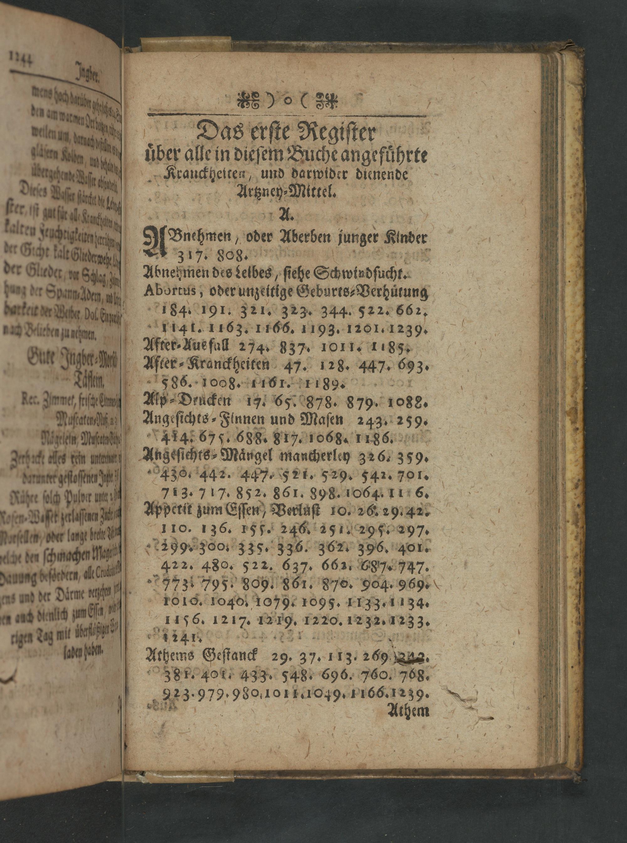 Das erſte Regiſter über alle in dieſem Buche angefuͤhrte Krauckheiten, und darwider dienende Aut Mittel. A. Abo, oder Aberben junge Kader 3171 888. c Abnehmen des Leibes, ſiehe Schwindſucht.