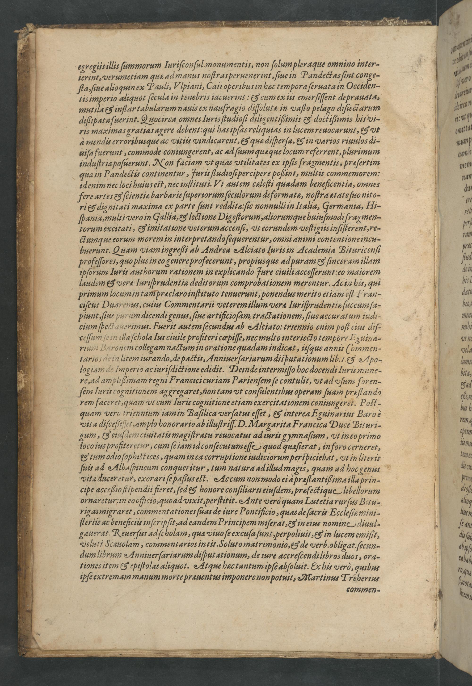 dumque eorum morem in interpretandoſequerentur, omni animi contentione incu- 4 buerunt. Quam viam ingreßi ab Andrea Alciato Iurisin Academia Bituricenſi b ha profeſſores, quo plus in eo genere profecerunt, propiusque ad puram tõ ſinceram illam ful Ipſorum Iuris authorum rationem in explicando Jure ciuili acceſſerunt: eo maiorem ſ 4 4 laudem s vera luriſprudentie deditorum comprobationem merentur. Ac in his, qui* hisl primum locumin tam præclaro inſtituto tenuerunt, ponendus merito ettam eſt Fran- Zlü ciſcus Duarenus, cuius Commentarii veteremillum vera luriſprudentia ſuccum/ſa- beo, piunt, ſine purum dicendi genus, ſine artificioſam tractationem, ſiue accuratum iud m cium ſpectauerimus. Fuerit autem ſecundus aꝗb Alciato: triennio enim poſi eius difſ un ceſſum ſein illa ſchola Ius ciuile profiteri cæpiſſe, nec multo interiectotempore Eguina- äun riuim Baronem collegam nactumin oratione quadam indicat, iiſque annis(bmmen àal⸗ tarios deinlitem iurando, de pactis, Anniuerſariarum dis putationum lib./ Apo- m logiam de Imperio aciuriſdictione edidit. Deinde intermiſſo hoc docendi luris munec bita, resad ampliſtimam regni Francici curiam Parienſem ſe contulit, vt ad vſum foren- ga fem laris cognitionem aggregaret, nontum vt conſulentibus operam ſuam praſlando rem faceret, quam vt eum Iuris cognitione etiam exercitationem coniungeret. Pofl- 54 quam vero triennium iamin Baſilica verſatus eſſet,& interea E guinarius Baroe 1 b Vita diſceſi ſet, amplo honorario abilluſtriſſ. D. Margarita Francica Duce Bituri- hn gum,( eiuſden czuitatis magiſtratu reuocatus ad iuris gymnaſium, vt in eo primo Phn locoius profiteretur, cum ſe iamid conſecutum eſſe quod quaſierat, in foro cerneret,. uumu eo' tum odio ſophustices, quam in ea corruptione iudiciorum peripiciebat, vt in literis Juis ad Albaſpineum conqueritur, tum naturaadilludmagis, quam ad hocgenn ii du vita daceretur, exorari ſe paßus eſt. Accum nonmodoeia præſtantißimailla prin- I cipe acceſsioſtipendii fieret, ſed&; honore conſiliarueiuſdem, prafectique libellorum dihſ ornareturt:in eo oſſicio, quoad Viwit, perſtitit. Ante vero quam Lutetia rurſus Bitu- alu rigas migraret, commentationes ſuas de iure Pontificio, quas de ſacri E coleſiæ mini- lup ſterius ac beneficius inſcripſit, ad eandem Principem muſerat,&o in eius nomine diuull 4 Kuu gauerat. Reuerſus adſcholam, quaæ viuo ſe excuſa ſunt, perpoliuit, k in lucem emijit, lu ſu veluti Icæuolam, commentarios in tit. Solutomatrimonio, té de verb. obligat ſecun- a pc dum librum&Anniuerſariarum diſputationum, de iure accreſcendi libros duos, ora- b Ohua0 da9 tiones item æ epiſtolas aliquot. Atque hæc tantum ipſe abſoluit. Ex his verò, quibus 2