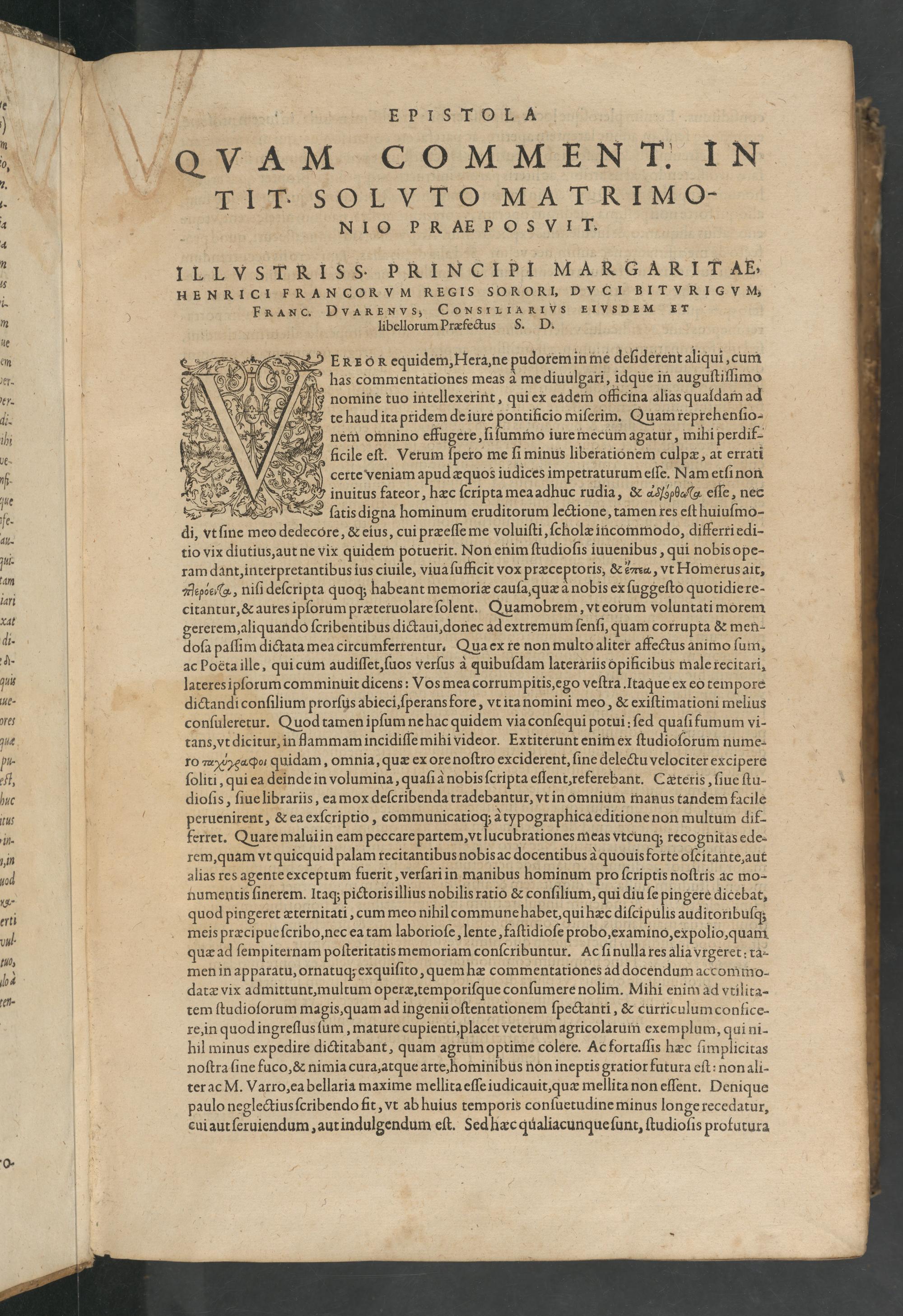 b 2 3 nomine tuo intellexerint, qui ex eadem officina alias quaſdam ad te haud ita pridem de iure pontificio miſerim. Quam re prehenſio- o nem omnino effugere, ſiſummo iure mecum agatur, mihi perdif- ficile eſt. Verum ſpero me ſi minus liberationem culpæ, at errati certe veniam apud æquos iudices impetraturum eſſe. Nam etſinon b See inuitus fateor, hæc ſcripta mea adhuc rudia,& ⁴νερα eſſe, nec fe. JS ſatis digna hominum eruditorum lectione, tamen res eſt huiuſmo- di, vt ſine meo dedecore,& eius, cui præeſſe me voluiſti, ſcholæ incommodo, differri edi- tio vix diutius, aut ne vix quidem potuerit. Non enim ſtudioſis iuuenibus, qui nobis ope- ram dant, interpretantibus ius ciuile, viua ſufficit vox præceptoris,& ema, vt Homerus ait, Mepoeα, niſi deſcripta quoq; habeant memoriæ cauſa, quæ a nobis ex ſuggeſto quotidiere- citantur,& aures ipſorum præteruolare ſolent. Quamobrem, vt eorum voluntati morem gererem, aliquando ſcribentibus dictaui, donec ad extremum ſenſi, quam corrupta& men- b doſa paſſim dictata mea circumferrentur. Qua ex te non multo aliter affectus animo ſum, ac Poèta ille, qui cum audiſſet, ſuos verſus à quibuſdam laterariis opificibus male recitari, un I ateres ipſorum comminuit dicens: Vos mea corrumpitis, ego veſtra. Itaque ex eo tempore 5e dadictandi conſilium prorſus abieci, ſperans fore, vt ita nomini meo,& exiſtimationi melius ofes conſuleretur. Quodtamen ipſum ne hac quidem via conſequi potui: ſed quaſi fumum vi- zue tans, vt dicitur, in Hammam incidiſſe mihi videor. Extiterunt enim ex ſtudioſorum nume- pu. ro ααμασ quidam, omnia, quæ ex ore noſtro exciderent, ſine delectu velociter exci pere eſt,“ ſoliti, qui ea deinde in volumina, quaſi à nobis ſcripta eſſent, referebant. Cæteris, ſiue ſtu- huc dioſis, ſiue librariis, ea mox deſcribenda tradebantur, vt in omnium manus tandem facile 8 peruenirent,& ea exſcriptio, communicatioq; à typographica editione non multum dif- in. ferret. Quare malui in eam peccare partem, vt lucubrationes meas vtcunq; recognitas ede- nin rem, quam vt quicquid palam recitantibus nobis ac docentibus a quouis forte oſcitante, aut hod alias res agente exceptum fuerit, verſari in manibus hominum pro ſcriptis noſtris ac mo- b numentis ſinerem. Itaq; pictoris illius nobilis ratio& conſilium, qui diu ſe pingere dicebat, quod pingeret æternitati, cum meo nihil commune habet, qui hæc diſcipulis auditoribuſq; meis præcipue ſcribo, nec ea tam laborioſe, lente, faſtidioſe probo, examino, expolio, quam quæ ad ſempiternam poſteritatis memoriam conſcribuntur. Ac ſi nulla res alia vrgeret: ra- . men in apparatu, ornatuq; exquiſito, quem hæ commentationes ad docendum accommo-