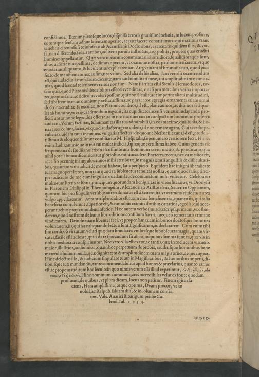 merendi ſtudium: nulla, quæ dignitatem& amplitudinem tuam magis ornet, atque augeat. Hinc delectus ille„& iudicium ſingulare tuum in Magiſtratibus„& honoribus im perii, di- tioniſque tuæ mandandis, tanto commendabilius apud bonos& præclarius, quanto rarius eſtac prope inauditum hoc ſeeulo: in quo nimis verum eſſeillud experimur, 2 τ μνν WS, S*ν εαιεμννκις. Hinc hominum commoditates incredibiles velut ex fonte quod am profluunt, de quibus, vr plura dicam, locus non patitur. Finem igiturfa- ciens, Hera ampliſſima, atque optima, Deum precor, vt te nobis, ac Reipub. ſaluam diu,& incolumem conſer- uer. Vale. Auarici Biturigum pridie Ca- lend. lul. r 5 5 3.