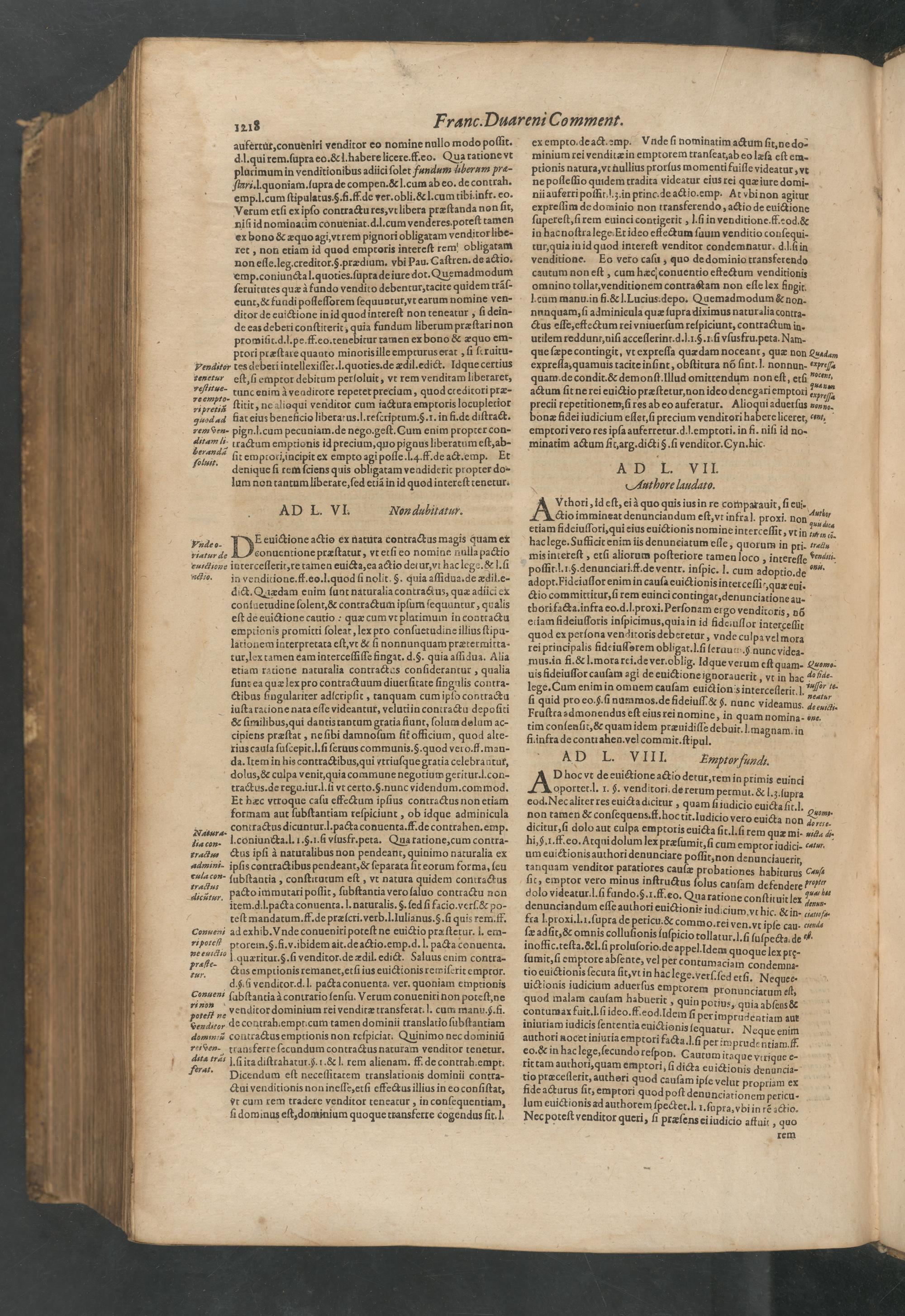 AD hoc vt de euictione actio detur, rem in primis euinci oportet. l. 1.§. venditori. de rerum permut.& l. 3. ſlupra eod. Nec aliter res euicta dicitur, quam ſi iudicio euicta ſt 1.„ non tamen& conſequens. fl. hoc tit. Iudicio vero euicta non 74 dicitur, ſ dolo aut culpa emptoris euicta ſit. l. ſi rem quæ mi-„e, 4. hi,§.I. ff. eo. Atqui dolum lex præſumit, ſi cum emptor iudici- catar. um euictionis authori denunciare poſſit, non denunciauerit tanquam venditor paratiores cauſæ probationes habiturus Cauſt ſit, emptor vero minus inſtructus ſolus cauſam defendere?"⁰ν³ν dolo videatur. l. ſi fundo.§. 1. ff. eo. Quaratione conſtituit lex 7˙⁶1“ denunciandum eſſe authori euictionie iud cium vt hic.& in- Senue fra l.proxi. l.i. ſupra de pericu.& commo. rei ven. vri le cau. v ſæ adſit,& omnis colluſionis ſuſpicio tollatur. J. ſi ſuſ luae de f. inoffic. teſta.&l. ſi proluſorio. de appel. Idem quo ulen 4 ſumit, ſi emptore abſente, vel per contumaciam dnenkne tio euictionis ſecuta ſit, vt in hac lege. verſ. ſed etſi. Nequee- uictionis iudicium aduerſus emptorem pronune iatu eſt quod malam cauſam habuerit, quin potius, quia aſeus& ar