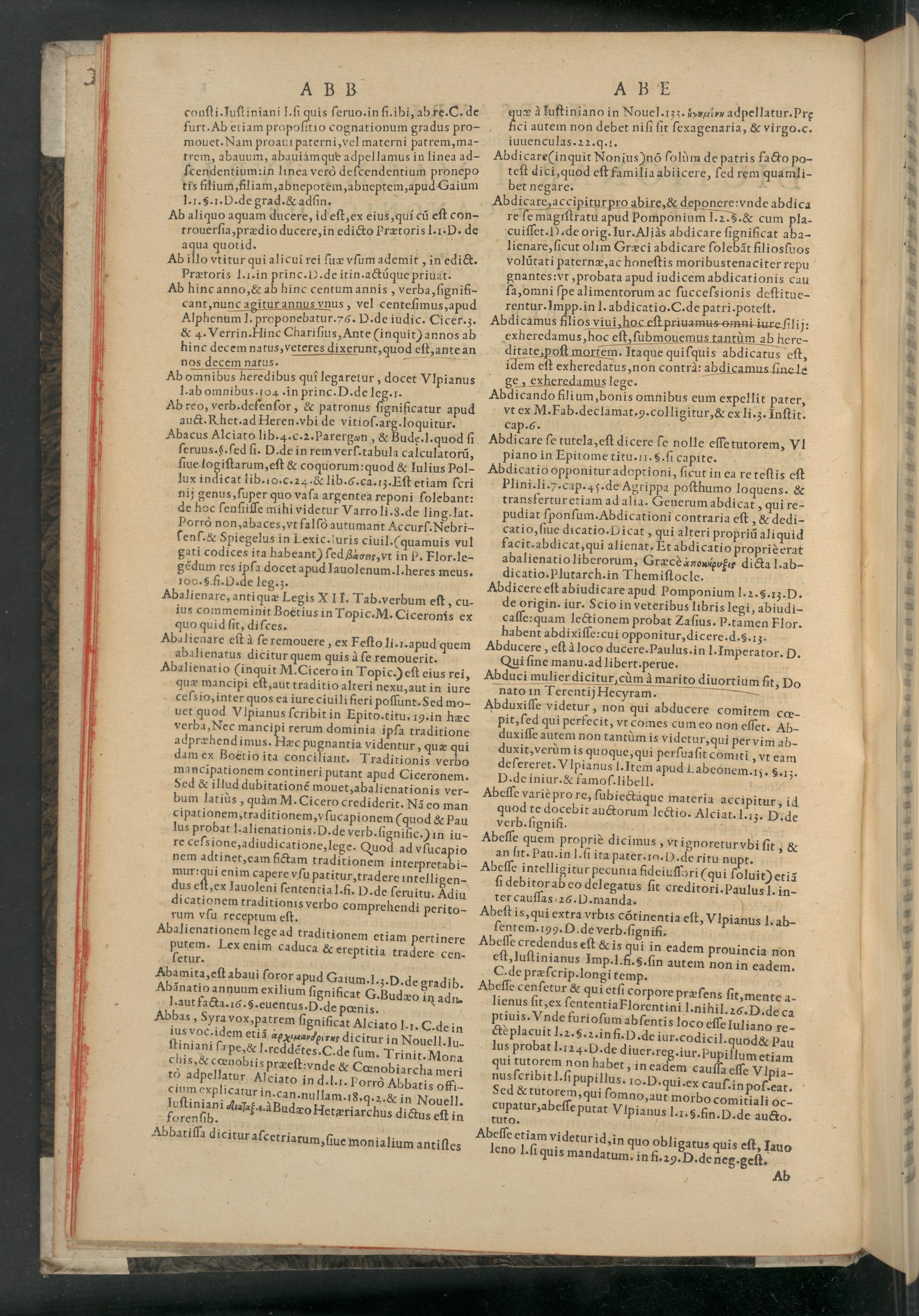 teſt dici, quod eſt familia abiicere, ſed rem quamli- bet negare. Abdicare, acci pitur pro abire,& deponere: vnde abdica re ſe magiſtratu apud Pomponium I. 2. S.& cum pla- cuiſſet. ⸗de orig. Jur. Aliàs abdicare ſignificat aba- lienare, ſicut olim Græci abdicare ſolebãt filiosſuos volũtati paternæ, ac honeſtis moribustenaciter repu gnantes: vt, probata apud iudicem abdicati onis cau ſa, omni ſpe alimentorum ac ſucceſsionis deſtitue- rentur. Impp. in l. abdicatio. C. de patri. poteſt. Abdicamus filios viui, h mni iure ſilij: exheredamus, hoc eſt, ſubmouemus tantùm ab here- ditate, poſt mortem. Itaque qui ſquis abdicatus eſt, idem eſt exheredatus, non contrà: abdicamus ſinc le ge, exheredamus lege. Abdicando filium, bonis omnibus eum expellit pater, vt ex M. Fab. declamat. ↄ. colligitur,& ex li. z. Inſtit. cap. 6. Abdicare ſe tutela, eſt dicere ſe nolle eſſe tutorem, VI piano in Epitome titu. 11.§. ſi capite. Abdicatio opponitur adoptioni, ſicut in ea re teſtis eſt Plini. li. 7. ap. 45.de Agrippa poſthumo loquens.& transfertur etiam ad alia. Generum abdicat„qui re- pudiat ſponſum. Abdicationi contraria eſt„& dedi- catio, ſiue dicatio. Dicat, qui alteri propriũ ali quid facit. abdicat, qui alienat, Et abdicatio proprièerat abalienatio liberorum, Græcè&mτοιουμε dicta l. ab- dicatio. Plutarch. in Themiſtocle. Abdicere eſt abiudicare apud Pomponium l. 2.§. 3. D. de origin. iur. Scio in veteribus libris legi, abiudi- caſſe: quam lectionem probat Zaſius. P. tamen Flor. habent abdixiſſe: cui opponitur, dicere. d. S. 13. Abducere, eſt à loco ducere. Paulus. in l. Imperator. D. Qui ſine manu. ad libert. perue. Abduci mulier dicitur, cùm à ma ito diuortium fit, Do