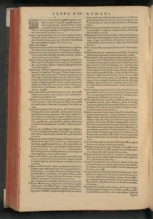 Pappiam de ciuitate tulit C. Pappius Trib. pleb. Cotta,& Manlio Coſs. anno V. C. pcxxCIIX. vt peregrini vr- be. Roma. expellerentur. Cice. 3. offic.& pro Balbo& pro Archia.& Dio lib. 37. quam legem ſæpiſsimè reuo- cauit CAKROLVS VALESIVS VIIII.Princeps no- ſter Gallorum Rex Chriſtianiſsimus. cui ſi non paren dum magiſtratus curent, ipſividerint.