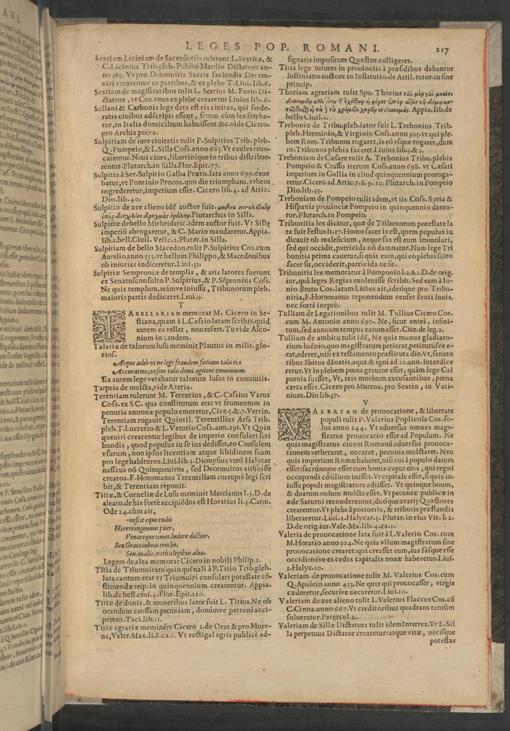 C.Licinius Trib-pleb. Publio Manlio Dictatorc an- no 385. Vrpro Duumuiris Sacris faciendis Decem- uiri crearentur ex patribus,& ex plebe T. Liui. lib. G. Sextiam de magiſtratibus tulit L. Sextius M. Furio Di- ttatore, vt Cos. vnus ex plebe crearetur Liuius lib. G. Sullani& Carbonis lege data eſt eis ciuitas, qui fœde- ratis ciuibus adſcripti eſſent, ſitum cùm lex fereba- tur, in Italia domicilium habuiſſent&c. vide Cicero. pro Archia poëta. b 85