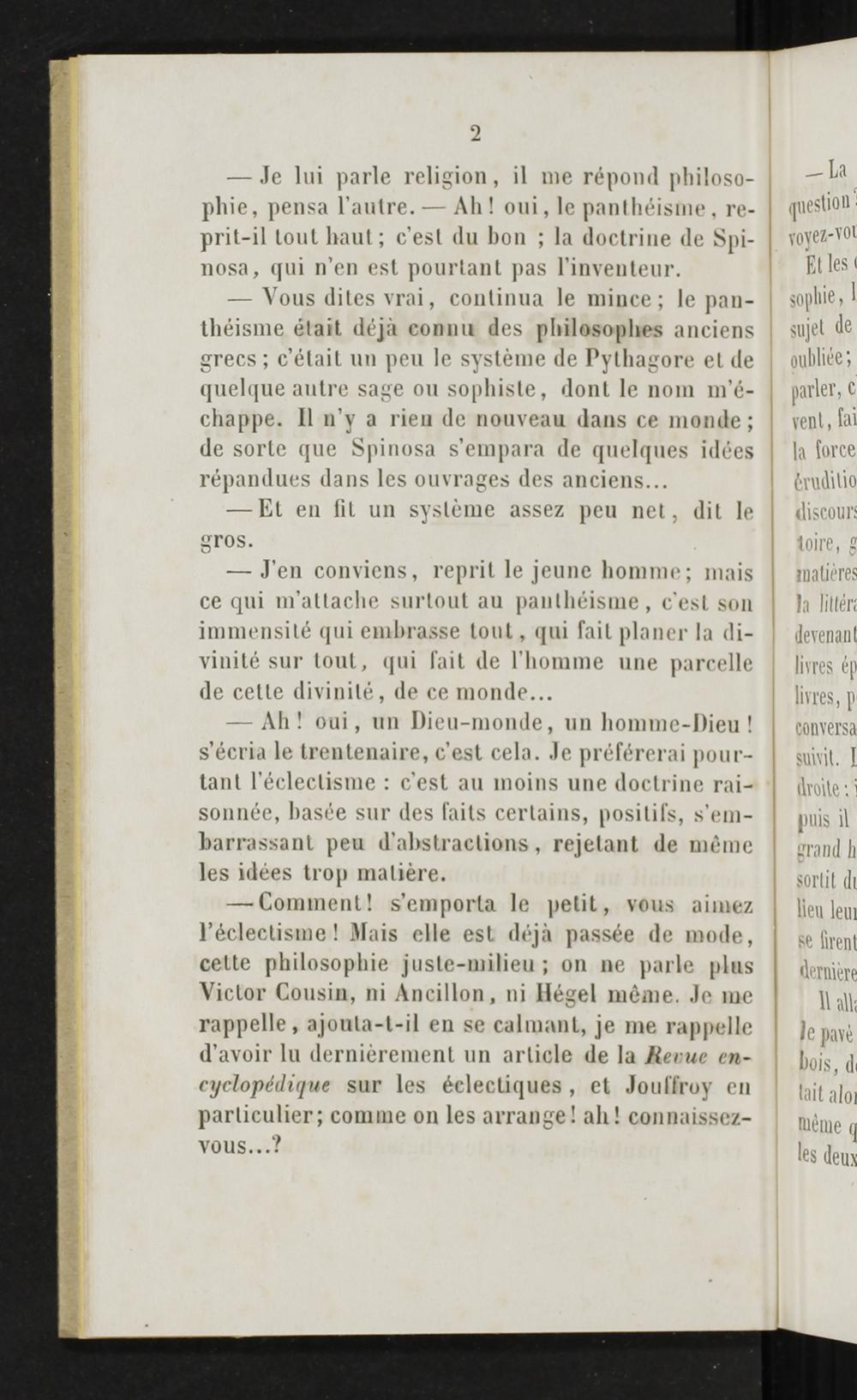— Je lui parle religion, il me r&pond philoso- phie, pensa l’autre.— Ah! oui, le pantheisme, re- prit-il tout haut; c’est du bon; la doetrine de Spi- nosa, qui n’en est pourtant pas linventeur.