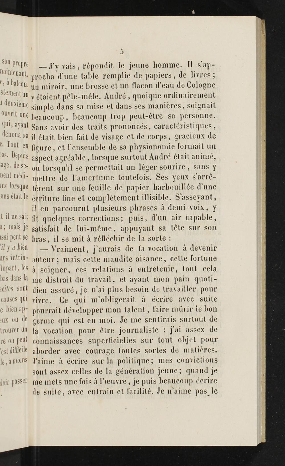 NR—!'y vais, repondit le jeune homme. Il s’ap- " nl procha d une table remplie de papiers, de livres; FE Ik Bu miroir, une hrosse el un lacon d’eau de Cologne dena yetaient p£le-mele. Andre, quoique ordinairement "EN simple dans sa mise et dans ses manieres, soignall UNE une peaucoup, beaucoup trop peut-Etre sa personne. U, Ayanl Sans avoir des traits prononces, caracleristiques, denona sa jl&tait bien fait de visage et de corps, gracieux de ' Tout en figure, et lensemble de sa physionomie formait un '0s. Depuis aspect agr&able, lorsque surtout Andre etail anime, ou lorsqu’il se permettait un leger sourire, sans y meltre de lamertume toulefois. Ses yeux s’arre- "s Jorsque jörent sur une feuille de papier barbouillde d’une ons elaille Seriture fine et completement illisible. S’asseyant, il en parcourut plusieurs phrases ä demi-voix, y til üesall fil quelques correclions; puis, d’un air capable, Y mals JE satisfait de lIui-meme, appuyant sa löle sur son ssı pulse pras, il se mit ä reflechir de la sorte:: ilya bien— Vraiment, j’aurais de Ja vocalion ä devenir irs MIND- auleur; mais celle maudite aisance, celle forlune lupart, les} soigner, ces relations ä enlrelenir, tout cela bas dans la me distrait du travail, et ayant mon pain quoti- eites sohl dien assurd, je n’ai plus besoin de travailler pour causes[I yivre, Ce qui m’obligerait a ecrire avec suile e bien ap- pourrait developper mon talent, faire mürir le bon ux ou de germe qui est en moi. Je me sentirais surloul de (rouver iM Ja vocalion pour&tre journaliste: j'ai assez de re on peul connaissances superficielles sur tout objet pour estdilfeile aborder avee courage toules sortes de malieres. je,amoins Jaime A€erire sur la politique; mes conviclions sont assez celles de la generation jeune; quand je Joir pass” me mets une fois Al’euvre, je puis beaucoup Eerire de suite, avec enlrain et facilite. Je n’aiıne pas_le