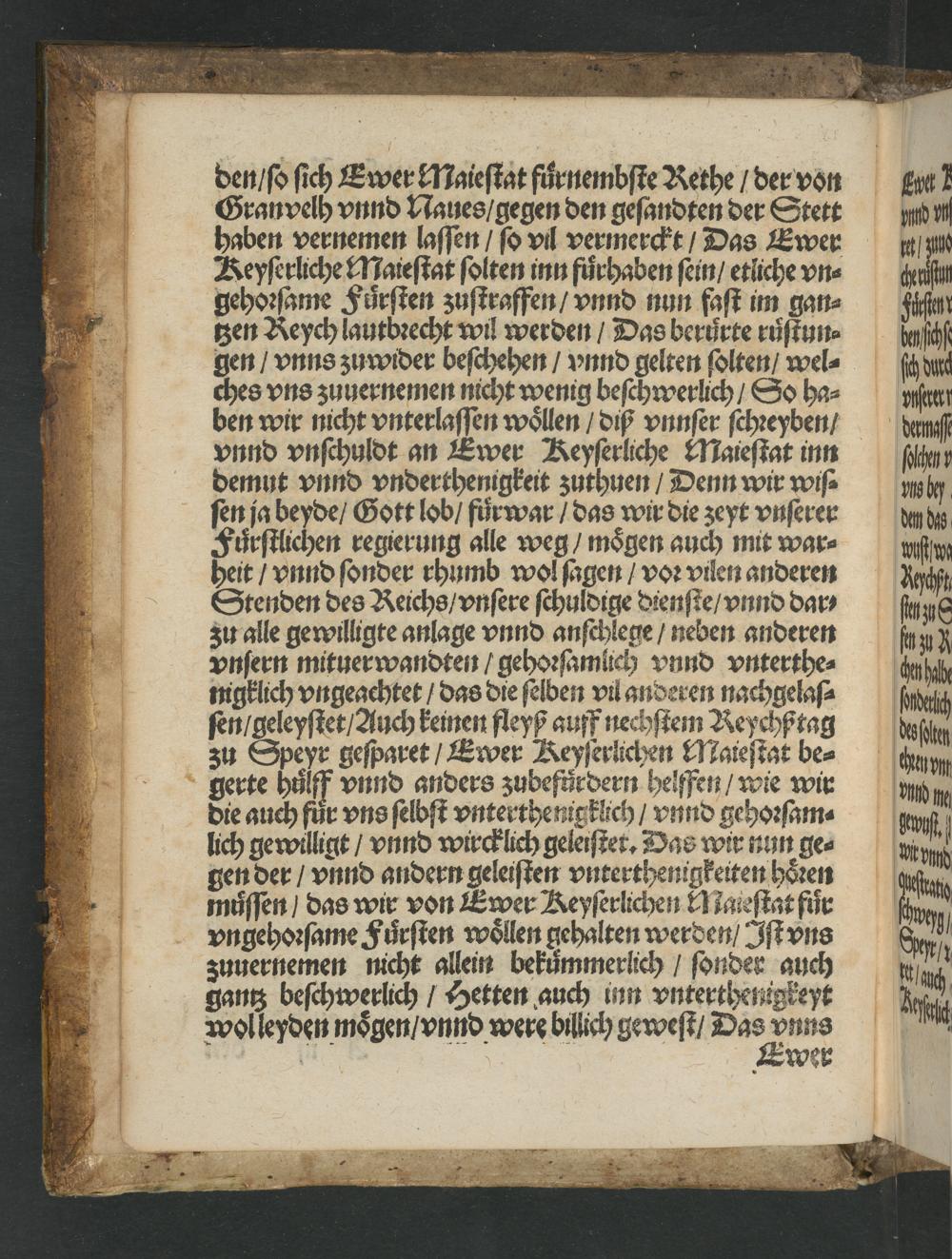den/ so sich Ewer Maiestat fůrnembste Rethe/ der von Gran velh vnnd Naues/ gegen den gesandten der Stett haben vernemen lassen/ so vil vermerckt/ Das Ewer Keyserliche ¶ aiestat solten inn fůrhaben sein/ etliche vn⸗ gehorsame Fürsten zustraffen/ vnnd nun fast im gan⸗ tzen Reych lautbrecht wil werden/ Das berurte rüstun⸗