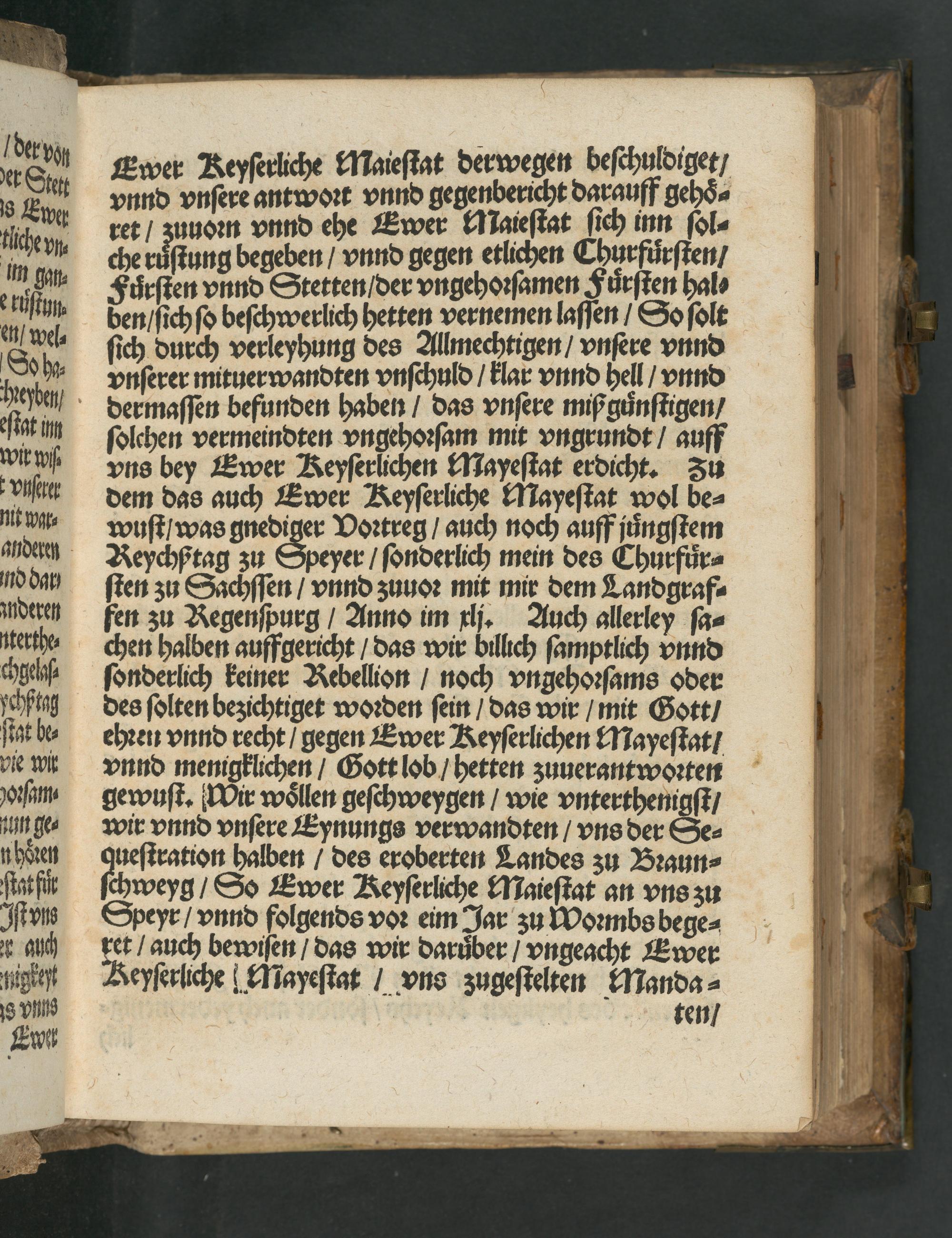 Ewer Keyserliche Maiestat der wegen beschuldiget/ vnnd vnsere antwort vnnd gegenbericht darauff gehö⸗ ret/ zunorn vnnd ehe Ewer HM aiestat sich inn sol⸗ che růstung begeben/ vnnd gegen etlichen Churfüͤrsten/ Fürsten vnnd Stetten/ der vngehorsamen Fuůͤrsten hal⸗ ben/ sich so beschwerlich hetten vernemen lassen/ So solt sich durch verleyhung des Allmechtigen/ vnsere vnnd vnserer mituerwandten vnschuld/ klar vnnd hell/ vnnd dermassen befunden haben/ das vnsere miß gůnstigen/ solchen vermeindten vngehorsam mit vngrundt/ auff vns bey Ewer Keyserlichen Mayestat erdicht. Zu dem das auch Ewer Keyserliche Mayestat wol be⸗ wust/ was 9 Vortreg/ auch noch auff jüngstem Reychßtag zu Speyer/ sonderlich mein des Churfür⸗ sten zu Sachssen/ vnnd zuuor mit mir dem Landgraf⸗ fen zu Regenspurg/ Anno im klj. Auch allerley sa⸗ chen halben auffgericht/ das wir billich samptlich vnnd sonderlich keiner Rebellion/ noch vngehorsams oder des solten bezichtiget worden sein/ das wir/ mit Gott/ ehren vnnd recht/ gegen Ewer Keyserlichen Mapyestat/ vnnd memgklichen/ Gott lob/ hetten ʒuuerantworten gewust. Wir wöllen geschweygen/ wie vnterthenigst/ wir vnnd vnsere Eynungs verwandten/ vns der Se⸗ 8 halben/ des eroberten Landes zu Braun⸗ chweyg/ So Ewer Keyserliche Maiestat an vns zu Speyr/ vnnd folgends vor eim Jar zu Wormbs bege⸗ et/ auch bewisen/ das wir daruber/ vngeacht Ewer Reyserliche! Mayestat/ vns zugestelten Manda⸗ eee Fe