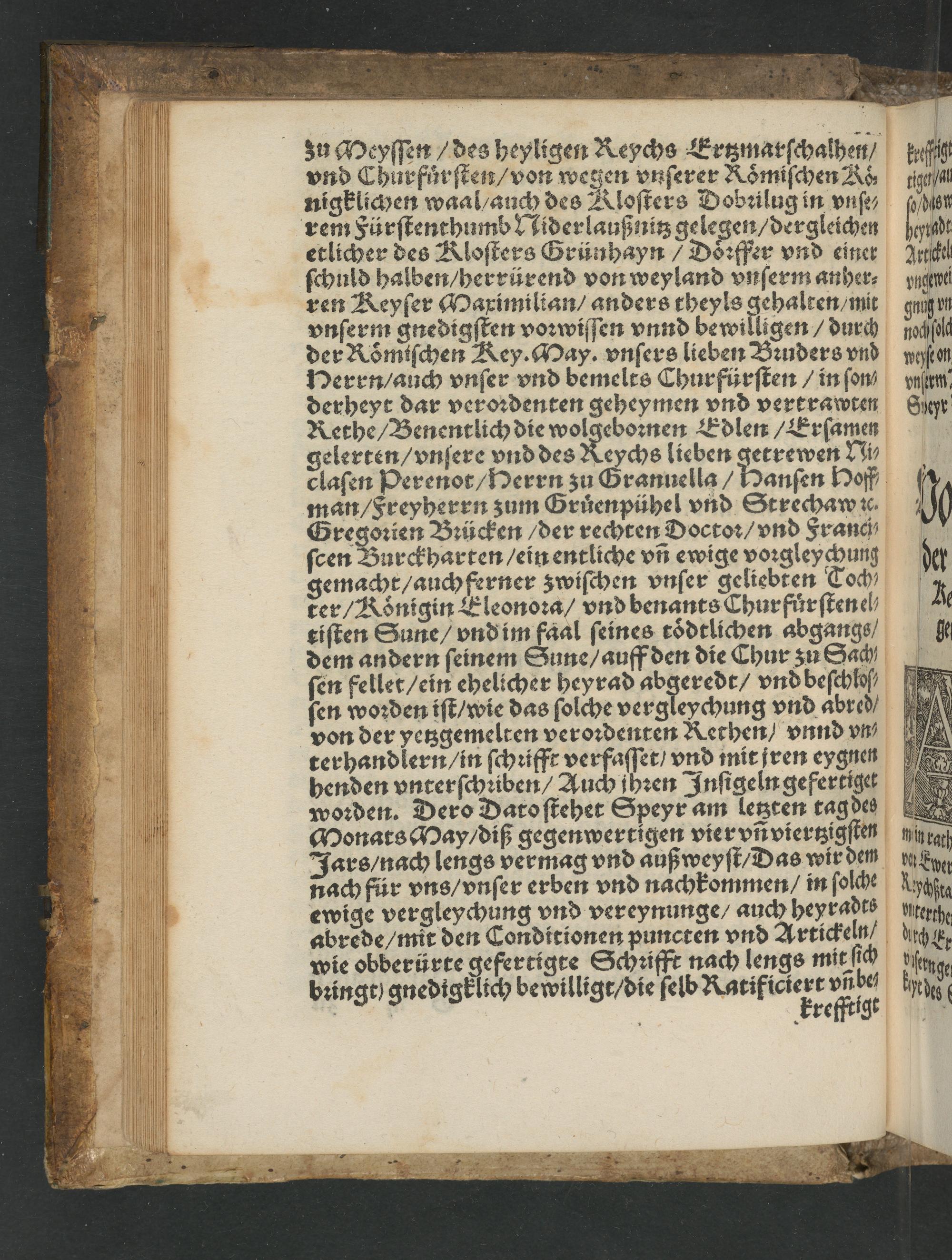 Gregorien Brücken/ der rechten Doctor/ vnd Franc scen Burckharten/ ein entliche vñ ewige vorgleychung gemacht/ auch ferner zwischen vnser geliebten Coch ter/ Königin Eleonora/ vnd benants Thur fürstenel tisten Sune/ vnd im faal seines tödtlichen abgangs/ dem andern seinem Sune/ auff den die Chur zu Sach sen fellet/ ein ehelicher heyrad abgeredt/ vnd beschlos⸗ sen worden ist/ wie das solche vergleychung vnd abred/ von der yetzgemelten verordenten Rethen/ vnnd vn terhandlern/ in schrifft verfasset/ vnd mit fren eygnen henden vnterschriben/ Auch jhren Insigeln gefertiget worden. Dero Dato stehet Speyr am letzten tag des Monats May/ diß gegen wertigen vier v viertzigsten Jars/ nach lengs vermag vnd auß weyst/ Das wir dem nach für vns/ vnser erben vnd nachkommen/ in solche ewige vergleychung vnd vereynunge/ auch heyradts