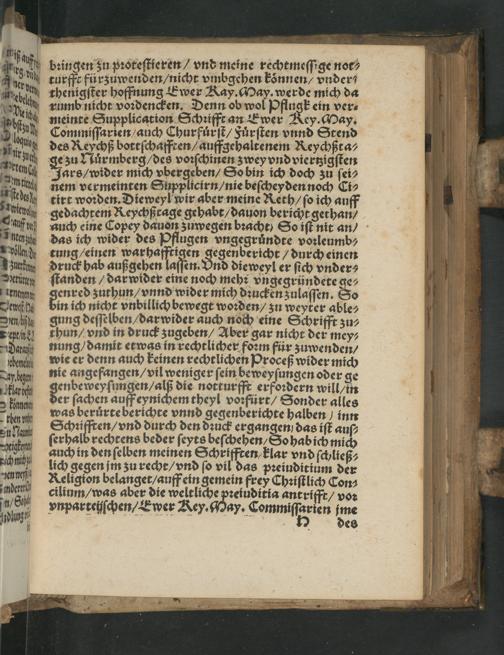 thun/ vnd in druck zugeben/ Aber gar nicht der mey⸗ nung/ damit etwas in rechtlicher form für zuwenden/ wie er denn auch keinen rechtlichen Proceß wider mich nie angefangen/ vil weniger sein beweysungen oder ge enbe weysungen/ alß die notturfft erfordern will/ in der sachen auff eynichem theyl vorfürt/ Sonder alles was berürte berichte vnnd gegenberichte halben inn Schrifften/ vnd durch den druck ergangen das ist aus⸗ serhalb rechtens beder seyts beschehen/ So hab ich mich auch in den selben meinen Schriften klar vnd schließ⸗ preiuditium der Religion belanget/ auff ein gemein frey Christlich Con⸗ cilium/ was aber die weltliche preiuditia antrifft/ vor vnpartesschen/ Ewer Ney. 2 N me des